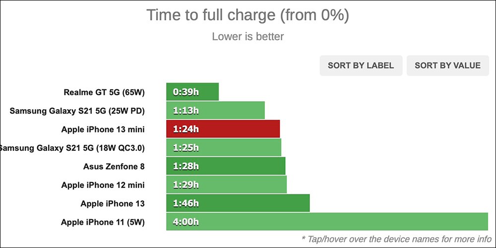 iPhone 13 mini 在充電 50 分鐘內達到 85% 電量,而最後的 15% 需要額外的 34 分鐘的涓流充電,這意味著在 1 小時 24 分鐘內充滿電。