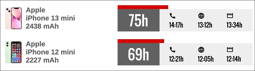 所幸在外媒測試的結果, iPhone 13 mini 相比前一代在電池續航的表現比想像中更好,加入平均待機算出的總續航時間約為 75 小時,比起 iPhone 13 mini 整整多了 6 小時。雖然也比 iPhone 13 少了 14 小時,不過會選擇 iPhone 13 mini 的消費者最喜愛它的輕便性,以這麼小的手機來說 iPhone 13 mini 表現仍相當不錯。