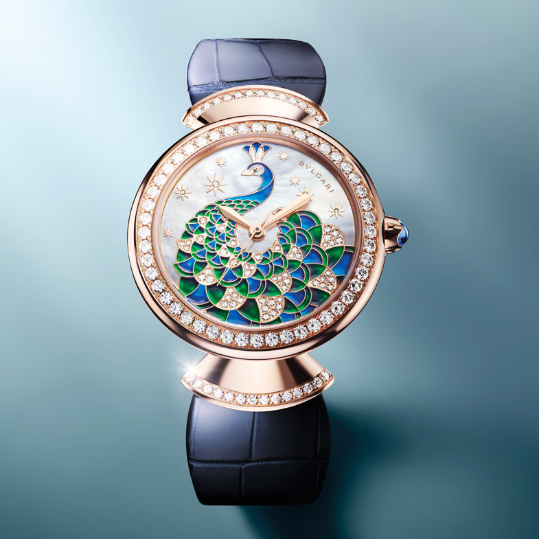 18K玫瑰金微繪孔雀圖鑲飾鑽石女錶