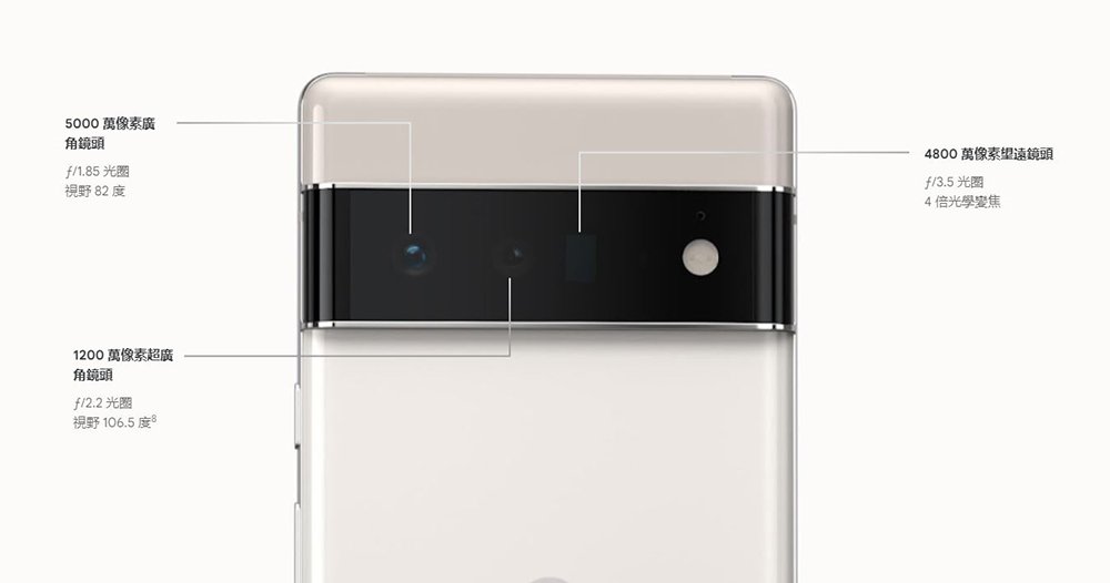 Pixel 6 Pro 配備 6.7 吋 QHD+ 顯示器,最高更新率為 120Hz,共有 12GB + 128GB 與 12GB +256GB(僅風暴黑有 256GB) 兩種版本,內建電池則為 5003mAh,同樣支援快充、快速無線充電與反向充電。後置 5000 萬畫素 F1.85 廣角主鏡 + 1200 萬畫素 F2.2 106.5 度超廣角鏡頭 + 4800 萬畫素 F3.5 4X 光學變焦望遠鏡頭;前置則是 1110 萬畫素 F2.2 自拍鏡頭。