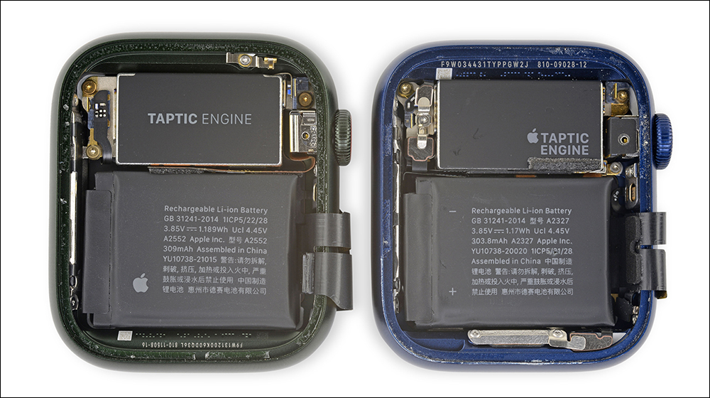 電池容量方面, Apple Watch Series 7 45mm 版本內建 1.189Wh 電池(309 mAh),比起 Apple Watch Series 6 44mm 版本的 1.17Wh 電池增加 1.6%。41mm 的 Apple Watch Series 7 配備 1.094Wh 電池,比起上一代 40mm 型號的 1.024Wh 電池增加 6.8%。(下圖左側為 Apple Watch Series 7 45mm ,右側則為 Apple Watch Series 6 44mm)。