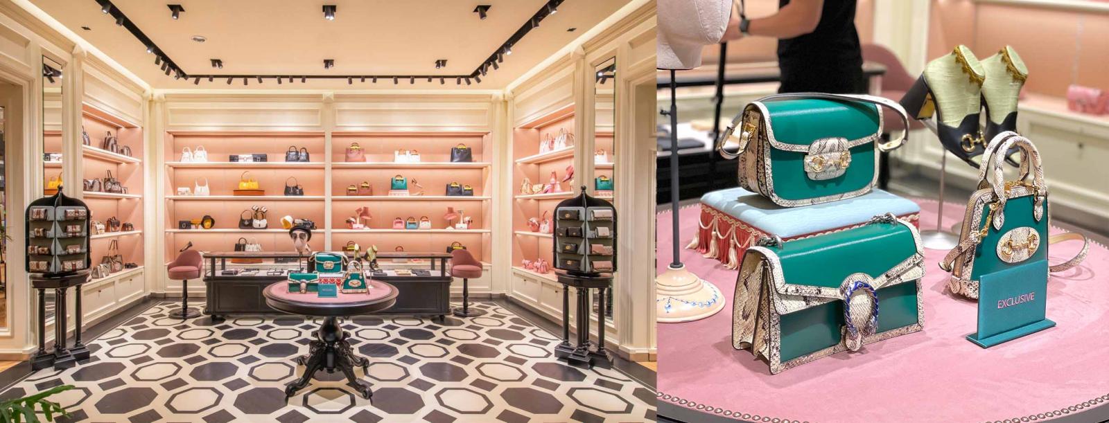 為了能讓大家一次看懂哪些是店裡必踩的打卡點,儂編特別請曾之喬、胡宇威和謝盈萱分別替我們選一個覺得店內最好拍的位置。像曾之喬就選擇了擺滿芭比粉配件的粉嫩牆,胡宇威則認為一進大門擺滿當季和限量商品的陳列區最氣派,謝盈萱則坐上奢華天鵝絨高腳椅替我們展現如何善用現場道具拍出大長腿效果,讓你親自融入這個同時結合傳統與現代、工業風與浪漫主義、華麗與優雅兼容並蓄的空間裡,成為Gucci家族的一份子!