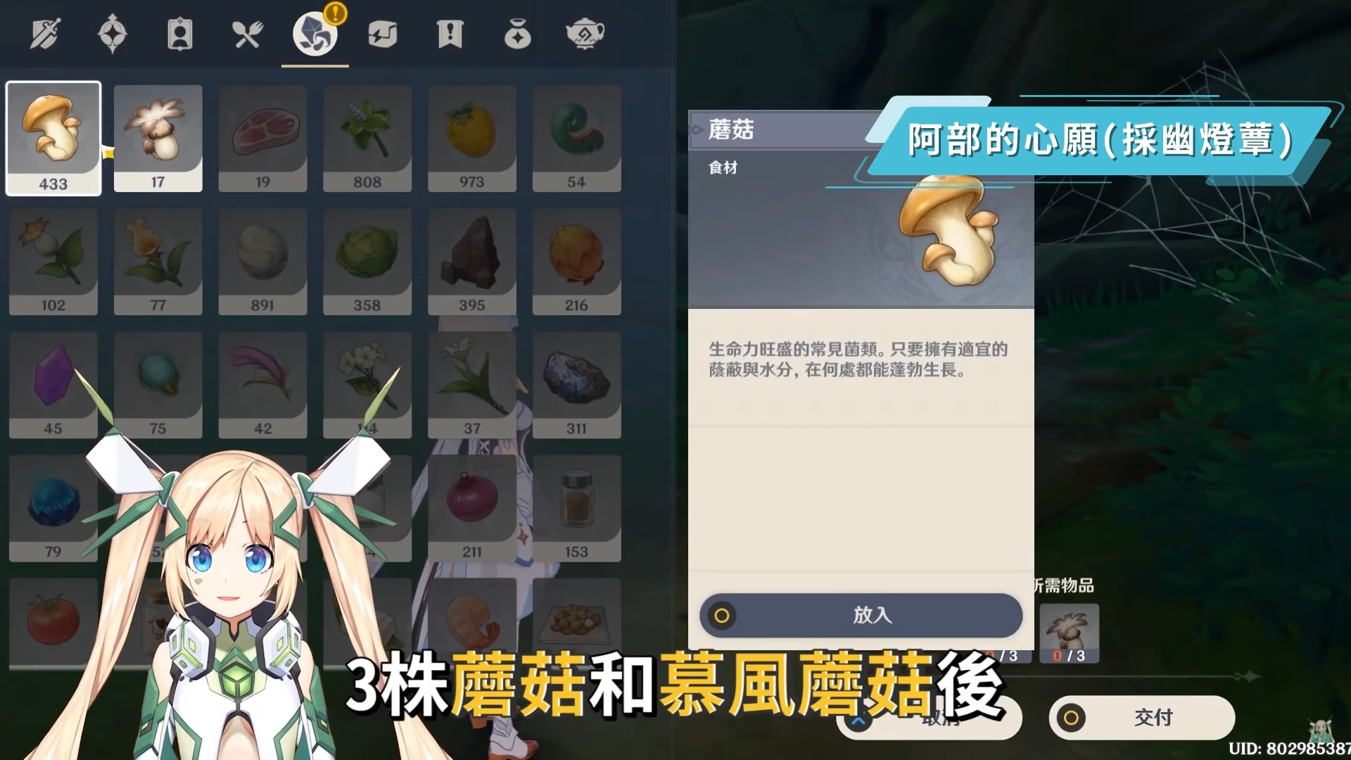 在解霧海紀行的過程中會來到千來神祠的地下遺跡深處,路上會經過一處有長著5株幽燈蕈的樹木,若解完霧海紀行四天的流程後,在這邊拔光幽燈蕈後會冒出阿部的幻影,警告你不要再拔他的幽燈蕈,接下來等2天讓幽燈蕈重生後再回來拔光,又會讓阿部生氣冒出,最後我們提供給他各3株蘑菇和慕風蘑菇後,完成他的心願,就可以獲得裝有20原石的精緻寶箱,任務不難,只是要等植物重生比較費時一點。而若是在解霧海紀行時不小心拔了幽燈蕈的話,就要解完霧海紀行後等幽燈蕈重生才能觸發。