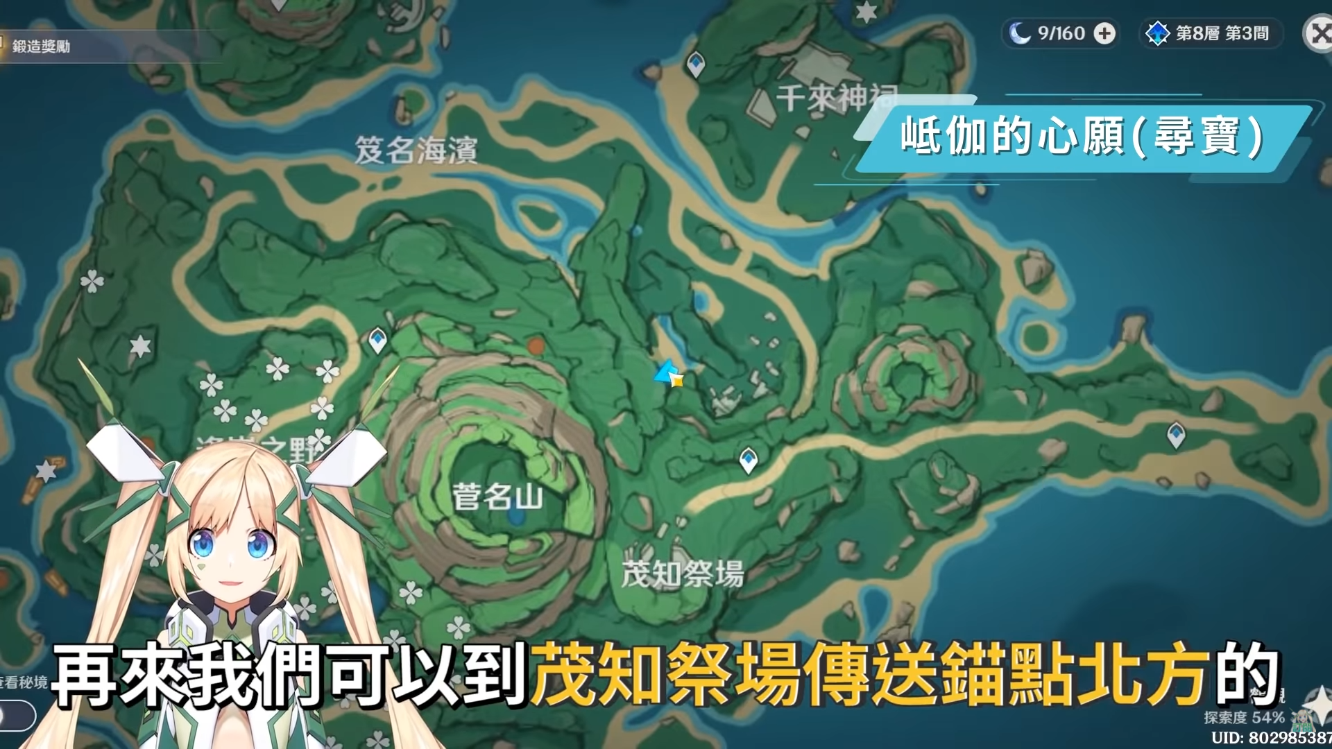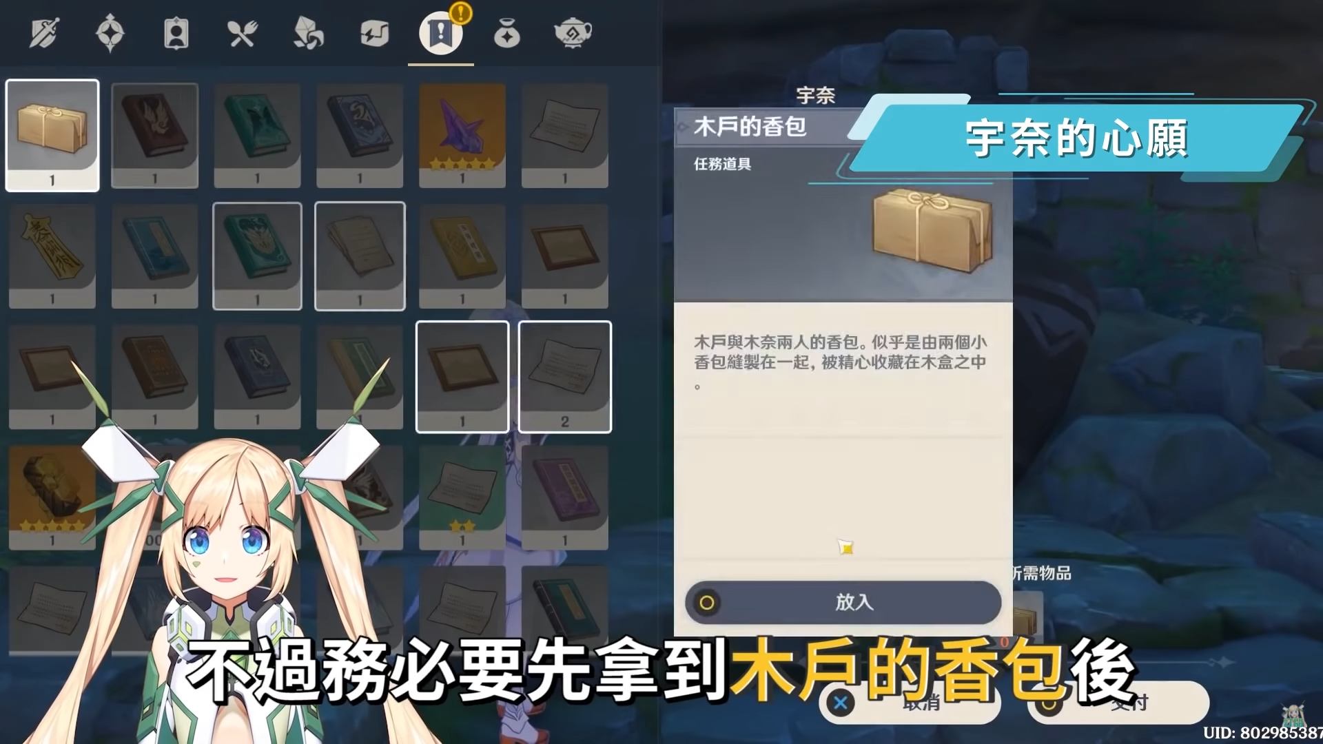宇奈就是前面木戶和木奈這對兄妹的奶奶,我們可以在茂知祭場的傳送錨點往北走一點的山崖下遇見她,每天來找她對話都可以獲得3份緋櫻繡球,連續四天,第五天再和宇奈奶奶對話就可以完成了,不過務必要先拿到木戶的香包後,在第五天跟奶奶對話才能讓她放心的離開這個地方上船,最後留下裝有20原石的精緻寶箱。