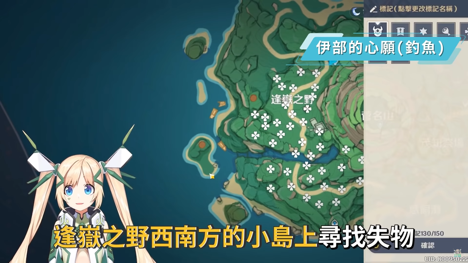 在千來神祠傳送錨點往西走一點的海灘可以找到一處漁點,釣起一隻魚後會觸發伊部的幻影出現,他需要我們幫他到逢嶽之野西南方的小島上尋找失物,在看到一個雷鳥石像後用羽毛與其感應,會發現這邊也有一個漁點,因此也是透過釣魚的方式來機率性釣出伊部的東西,有些人可能會需要釣個幾次,而洛洛剛好運氣比較好一隻就出現,若是一直沒有釣到可以試著切換日夜看看,若是仍不出現就要等魚重生時間結束後再回來,成功的話會釣到牧梨的護身符,接著再回去找伊部回報,讓他放心登船後即可獲得裝有30原石的珍貴寶箱。