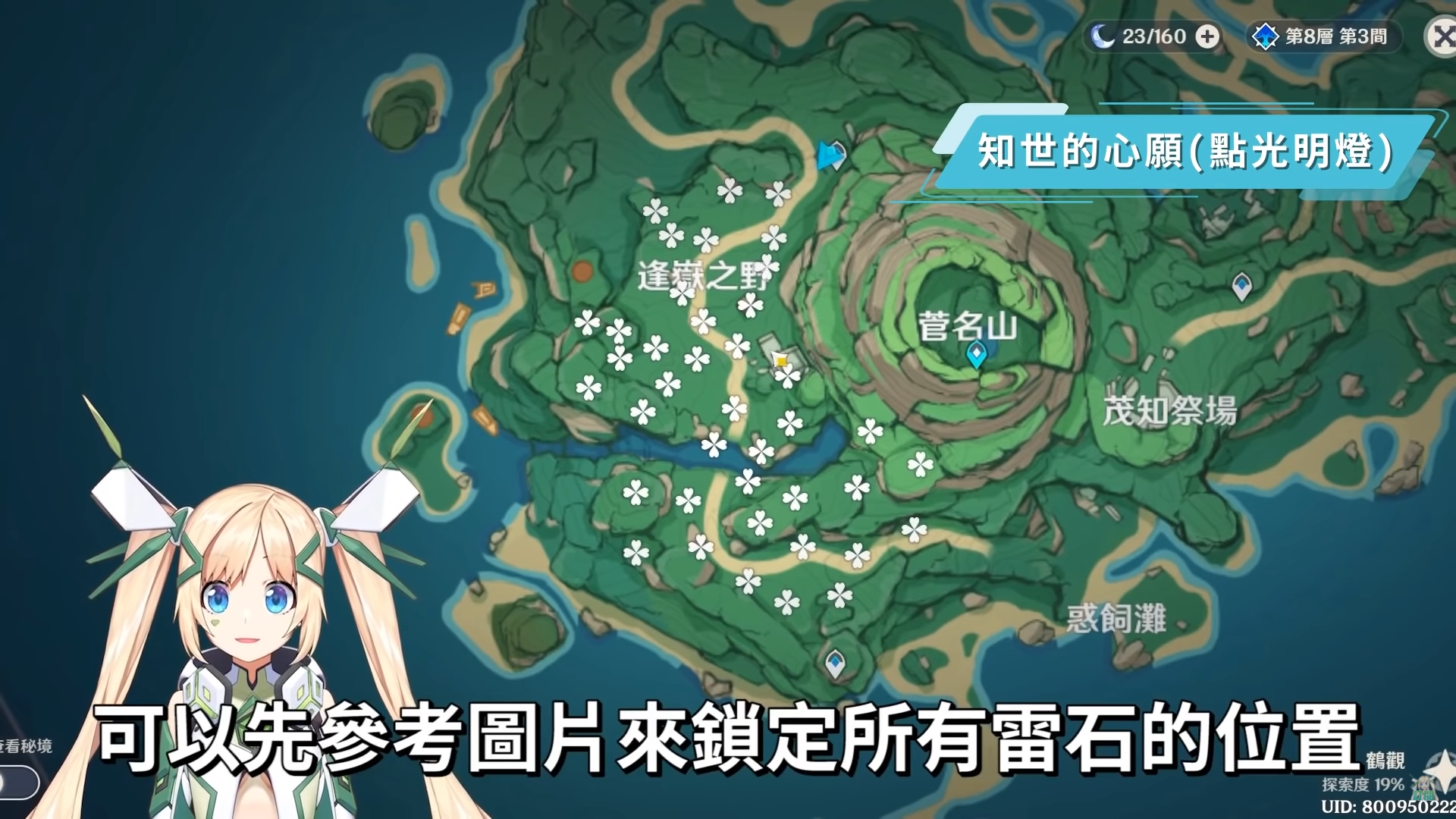 在我們來到逢嶽之野傳送錨點往南走一點的路旁就會遇到知世的幻影,疑神疑鬼的她一直因為擔心自己觸怒雷鳥大人而不肯離開,因此身為盡責的送行者,到了知世這名幻影也是需要來幫她點亮光明燈的,我們的目標是要點亮在逢嶽之野這塊區域的所有雷石,可以先參考圖片來鎖定所有雷石的位置,數量有點多,共有40個,有些在雷鳥石像旁的雷石,若是沒有使用羽毛的話是不會出現的,因此看到石像要反射動作直接使用羽毛感應,若是沒有點完所有的雷石知世是不會離開的,而且她也不會提示你還剩下幾個,只會重複「我的時間不多了」這句話,因此全部點完光明燈她才會離開,若是想要參考路線全程的話也可以查看洛洛的畫面。光明燈的位置距離間隔都差不多,在點燈的過程中也建議可以一邊在自己的地圖上標記,以免最後漏了其中一個還要從頭開始找。當全部點完後與其對話,知世就會覺得雷鳥大人已經原諒她了,也就放心上船了,我們也可以獲得裝有40原石的珍貴寶箱和成就《霧裡明燈》。
