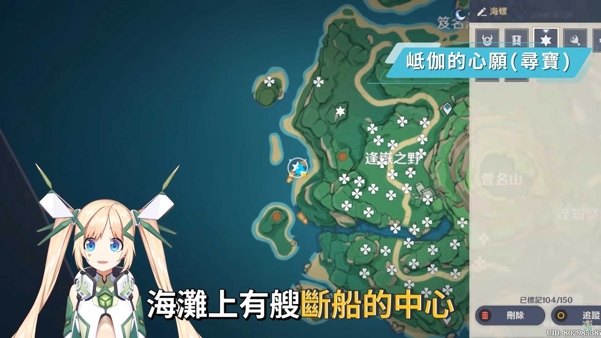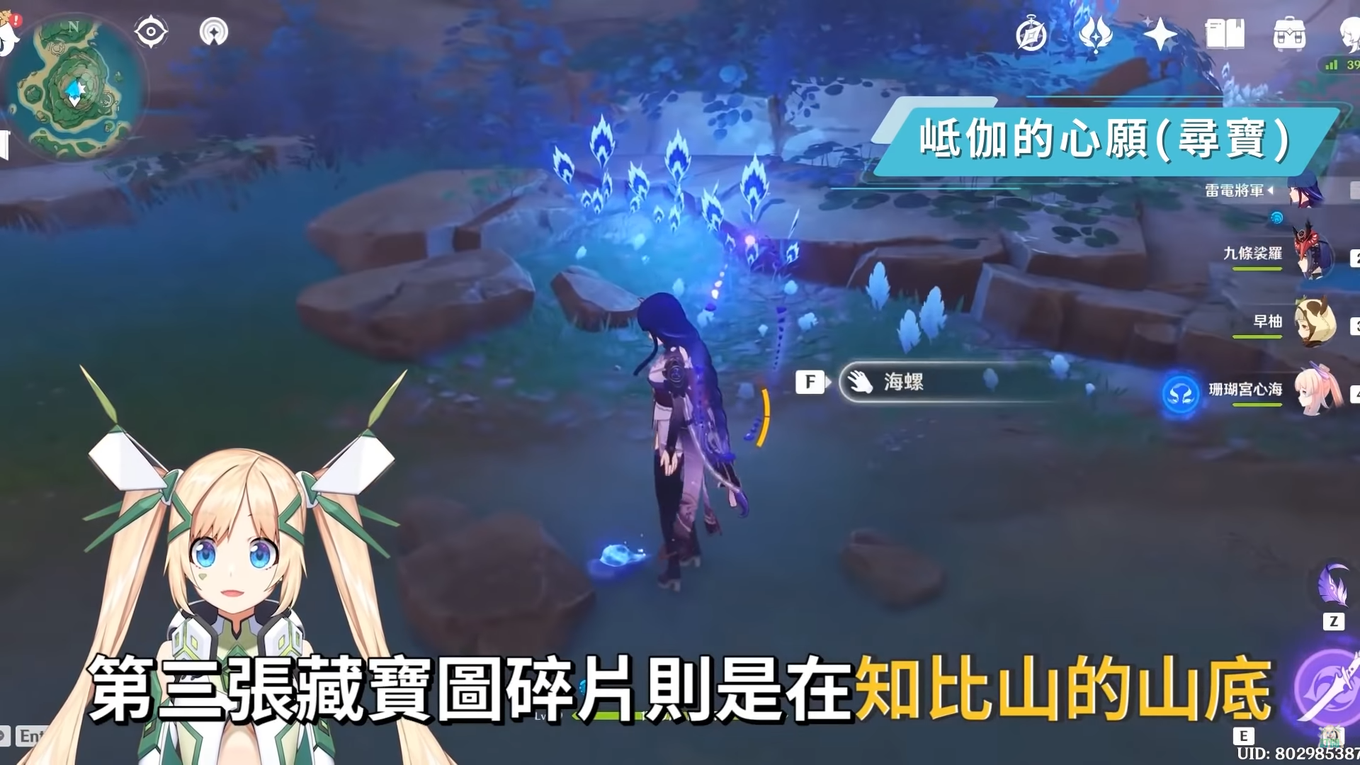 如果有解完霧海紀行四天的任務後,來到七天神像會在浪船錨點附近的地上發現一個海螺,撿起來後會出現岻伽的幻影,而後可以獲得一張藏寶圖的碎片,再來我們可以到茂知祭場傳送錨點北方的遺跡找到第二張藏寶圖碎片,若是看不到可以把旁邊的陶罐打掉,第三張藏寶圖碎片則是在知比山的山底,位在一個雷鳥石像的附近,第四張藏寶圖則在逢嶽之野西方的海灘上有艘斷船的中心,四張藏寶圖都蒐集好之後,可以回到七天神像稍微往北走一點的懸崖邊找到岻伽回報,接著他會給我們一張完整的藏寶圖,而後就可以讓他毫無掛念的上船了,最後我們再來到菅名山山底的雷鳥石雕前,若出現可以挖掘的字樣就可以順利挖出珍貴寶箱,獲得30原石,旁邊也有一封信是關於劇情,可以查看了解。