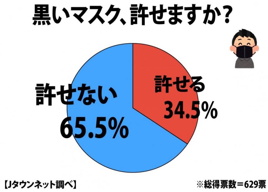 Jタウンネット就着「能接受黑色口罩嗎?」在日本全國作了調查,得出下圖的結論: