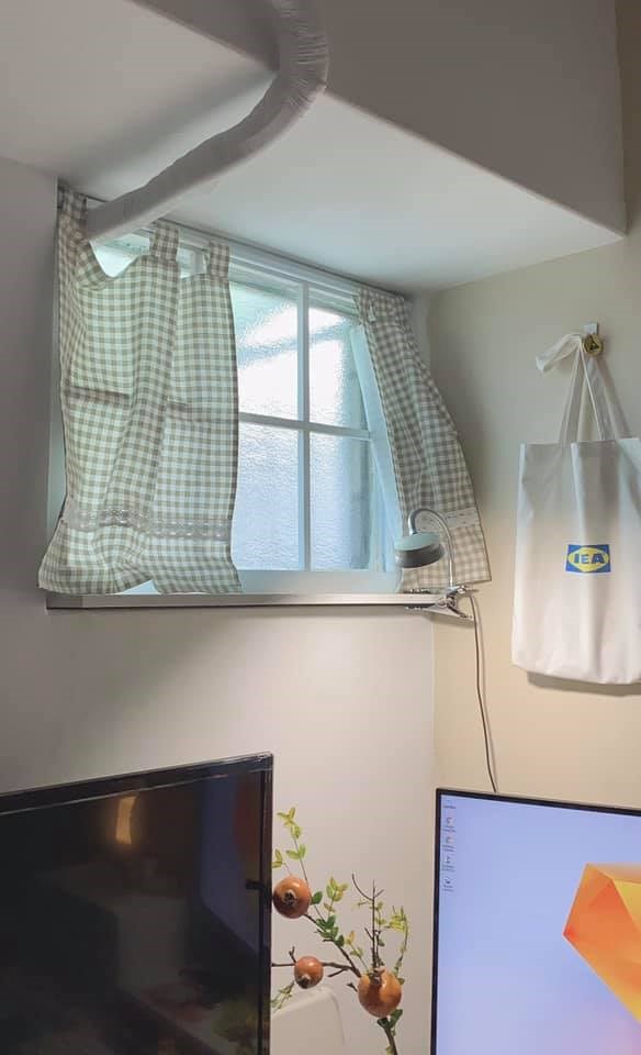入住之後,她發現冷氣牆壁漏水,導致發燙,後續與房東協商換成分離式冷氣,外牆也緊急用矽利康修補裂縫,來防止滲水。不過,窗型冷氣孔就變成一個需要補上的空間,加上原先套房只有一扇窗戶,因此她就採取「讓窗戶回歸成窗戶」的概念做美化,做出鄉村風的假窗,既能保留採光,又可以增添空間美感。