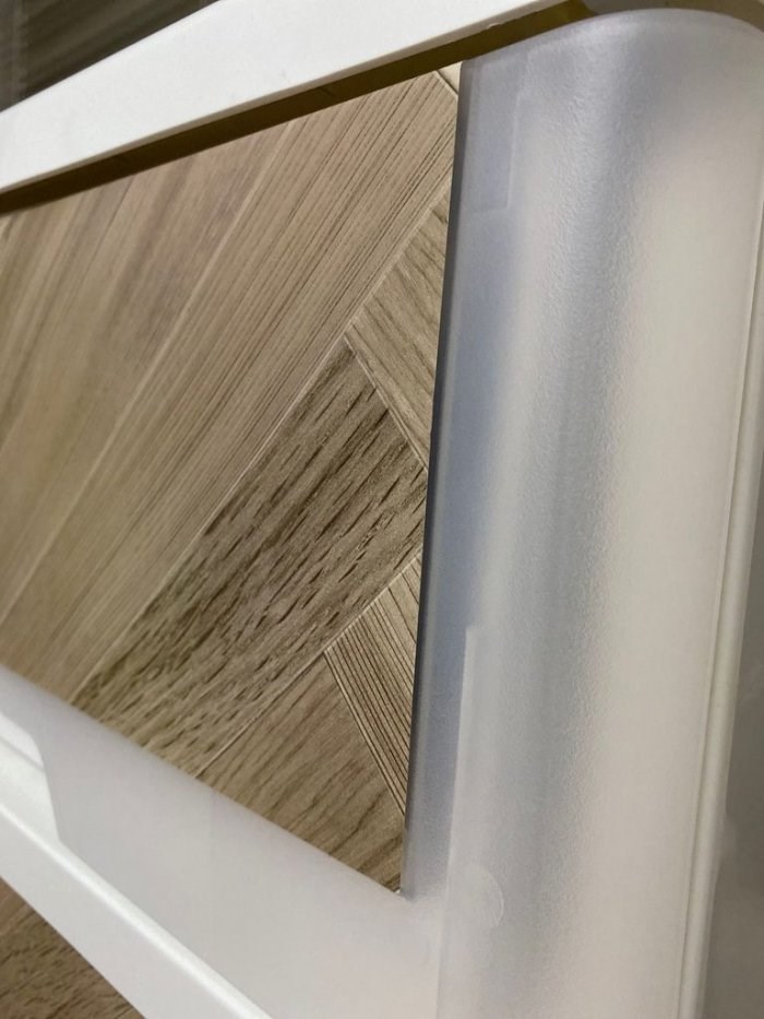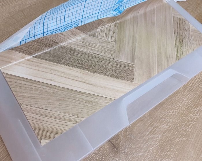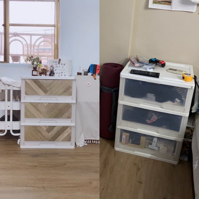 除了地板及牆面,收納櫃的樣子也是改造重點,透明的櫃子讓裡面的睡衣、內衣褲和很多雜物,看起來很亂,所以她去大創買了木紋壁貼,決定先貼中間的長方區域實驗看看,結果三層都貼完後覺得效果不錯。