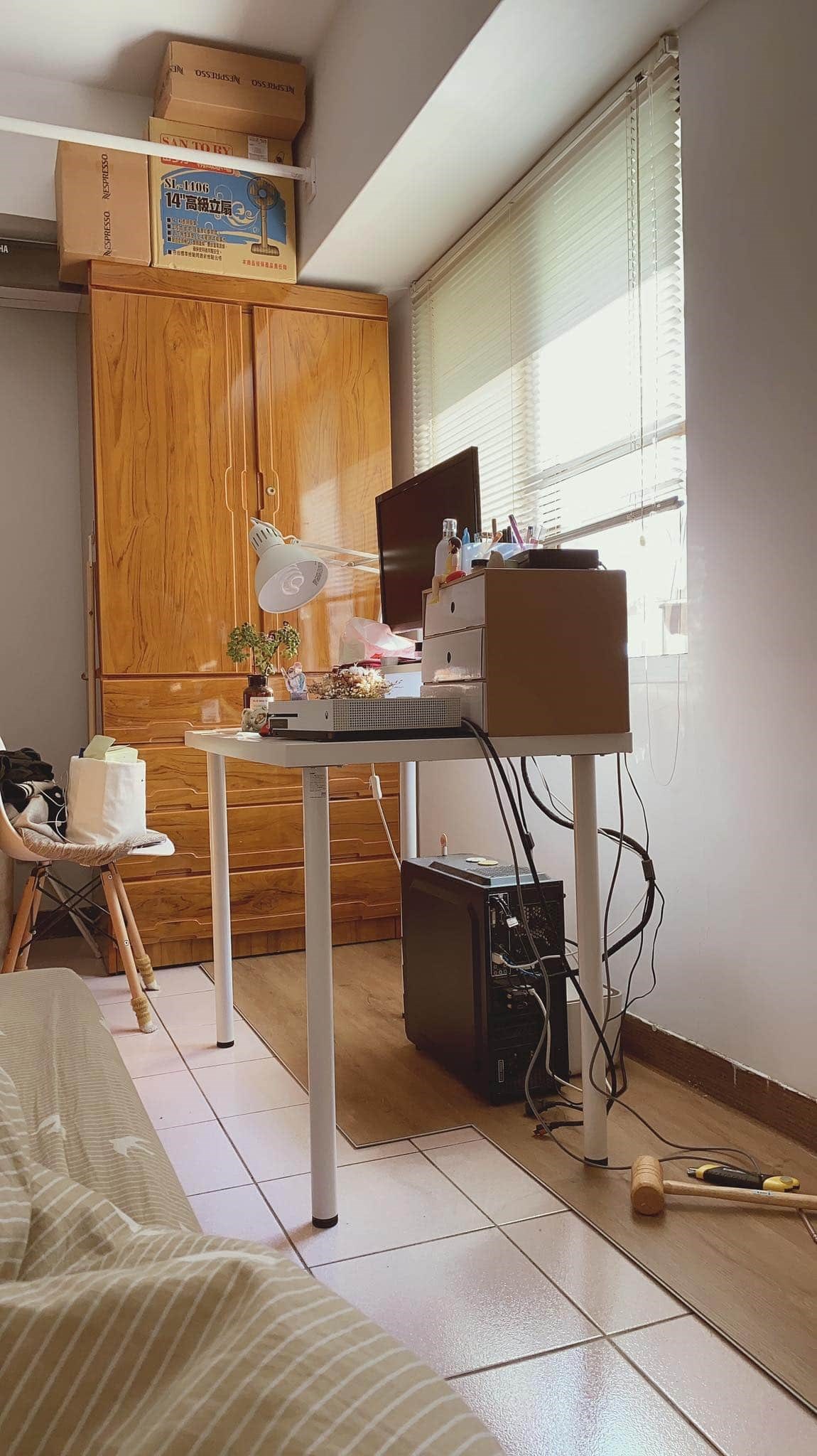 她使用的是水電用美工刀、小木槌,以及一本厚一點的書充當木頭,美工刀用大把、堅硬一點的就可以,然後多用力畫幾下就好,只是遇到特殊的門邊造型與 L 型牆角,可以去跟特力屋借線鋸機之類的比較方便。鋪完後整個空間質感,真的大大提升,超級有成就感的,而且由於床和衣櫃的下方沒鋪,所以 8 包地板還剩下整整 2 包,也沒有收邊,方便退租後拆除。