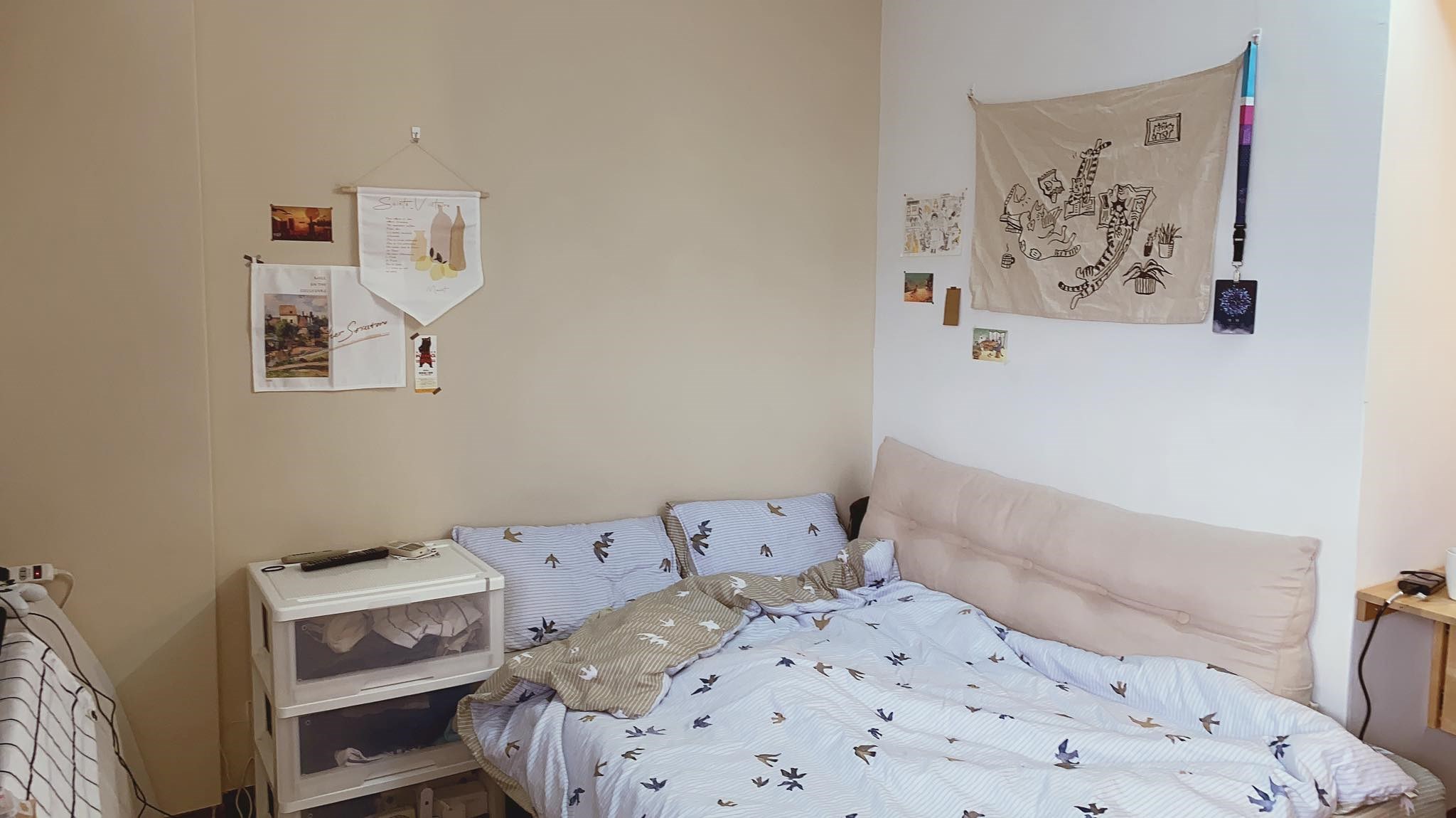 搬進來之後,她一直有想要改造租屋的念頭,因此先到線上的居家設計網站,規劃了空間草圖。然後在入住半年後,請朋友一起來幫忙粉刷牆壁,全室刷了虹牌的純白油漆,床頭牆則漆了一面米色來當作跳色。不過,米色其實本來是要再咖啡一點,因為網友有說漆牆後,會有些許色差,所以就買淺一點的顏色,結果事實證明,還是要相信虹牌網站的演色系統,實際粉刷和網站上的顏色幾乎一樣。