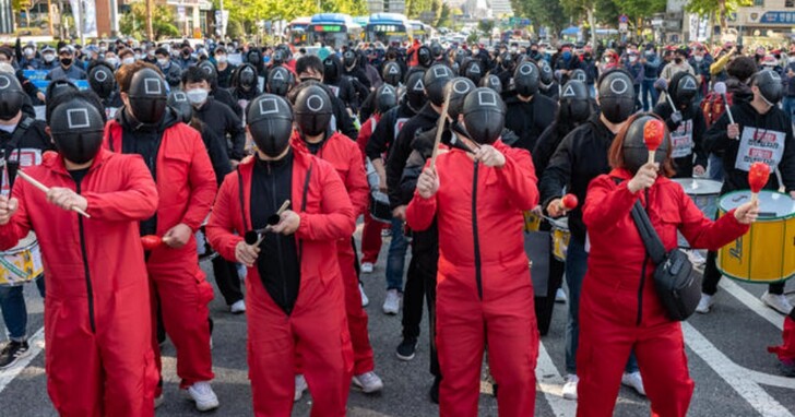 有些抗議者試圖抓住Netflix的《魷魚遊戲》大受歡迎的機會,以引起人們對他們要求改善就業條件的關注。許多人穿著從這部劇中工作者所穿的制服出現,畢竟這部劇本身就是由許多韓國人面臨的嚴峻的經濟狀況所激發的。