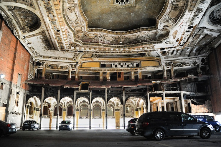 這次的大秀場地 Bottega Veneta 選在建立於 1926 年的一座音樂廳,屋頂梁柱上的巴洛克式雕刻,可想像當時的繁榮光景,但周圍反差的磚牆泥作,則是在 1976 年後,該場地在經濟沒落下,轉型為停車場所做的改變,這次的大秀場地,不僅 “半成品” 感的環境,讓不用花太多力氣就能有個超吸睛的場地外,同時也能在此感受底特律的興衰。