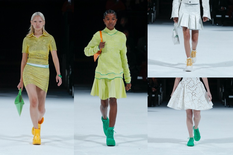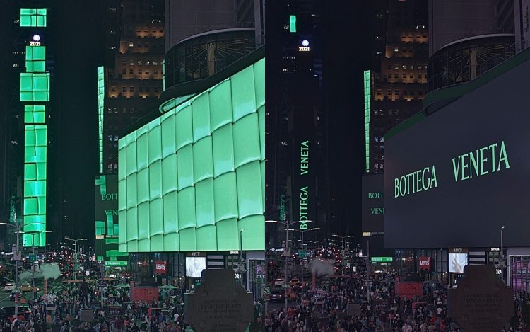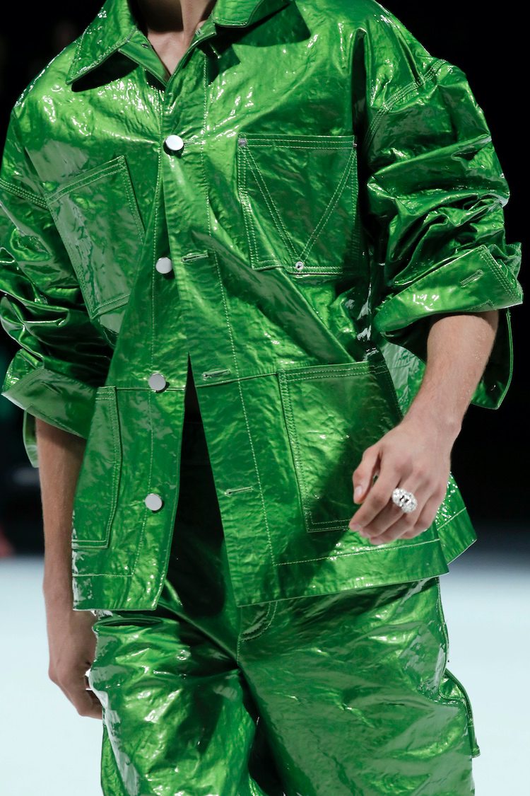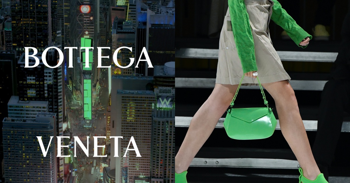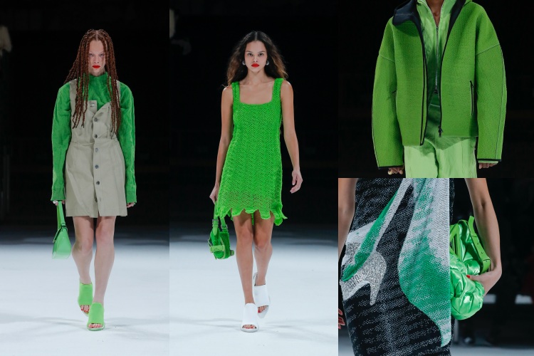 品牌獨樹一格的綠來取代 Logo,成為 Bottega Veneta 最標誌性的代表色,在這次秀上依然有大量的 “BV綠” 出現,在近期品牌更包下時代廣場,在放映本季大秀後,便運用 BV 綠做結尾,加深大家對這個色彩的印象,即便不靠品牌 Logo,看到這個色彩馬上就能聯想到 Bottega Veneta。