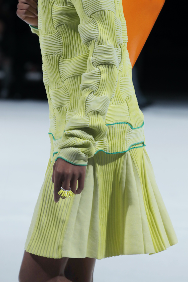 編織是 Bottega Veneta 的強項,同時也是 Daniel Lee 最擅長玩弄的戲法,過去在聖馬丁學院即鑽研針織的他,在本季的服裝及配件上,拿掉過去品牌招牌的皮革編織,運用獨特材質,展現他的針織長才外,同時也上 Bottega Veneta 在編織這項技藝中,有新的呈現方式。
