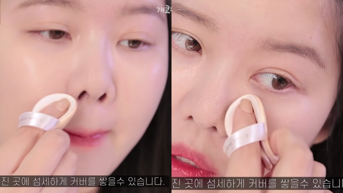 接著,針對鼻翼、嘴角、淚溝等等容易泛紅或暗沈的地方,我們更需要加強遮瑕,但其實不需要遮瑕膏,我們只需要改變一下握粉撲方式,單靠氣墊粉餅也可以提升遮瑕力哦!