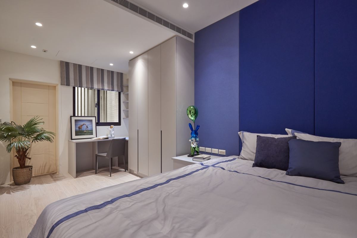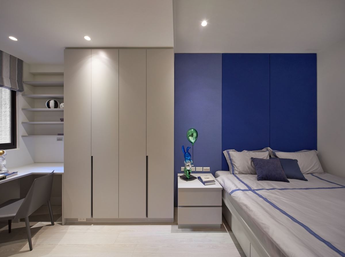 男孩房以藍色為基調,滿足屋主兒子喜愛海洋的愜意與自在感,床頭繃布藉由深淺藍色系的鋪陳,創造主題視覺牆;並以系統傢俱整合書桌、衣櫃與床頭櫃,而為了能夠容納特大雙人床的尺寸,特別客製系統櫃床架,且搭配床下抽屜來強化收納機能,運用線條延伸視覺以及貼合空間的絕佳比例,讓全棟別墅裡最封閉的小房間,也有舒服寬廣的視覺效果,令人印象深刻!