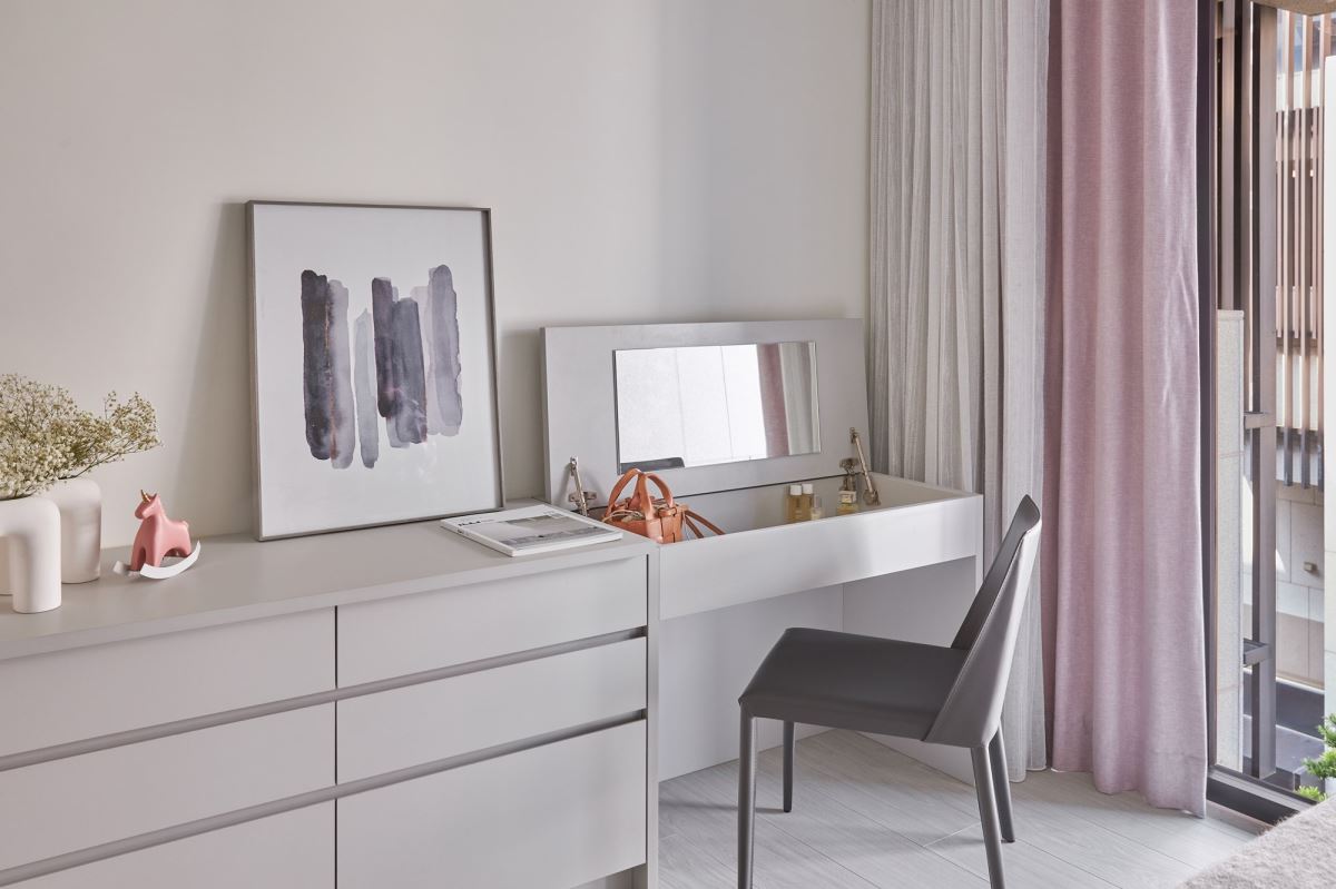 小孩房以莫蘭迪色彩為基底,揉入藍、綠色調,展現靜謐、柔和休憩環境。大女兒房以米灰色調、碎花圖騰的壁紙為基底,伴隨花藝植栽的點綴,傾吐浪漫氣息;床頭系統板材抓出適度比例,讓床與衣櫃間空出一條過道,方便到衣櫃拉取門扇與拿取衣服穿搭的舒適度;梳妝台兼具書桌功能,透過上掀櫃體的設計收納保養、化妝品,收納於無形的作法,讓空間更顯乾淨、簡潔。