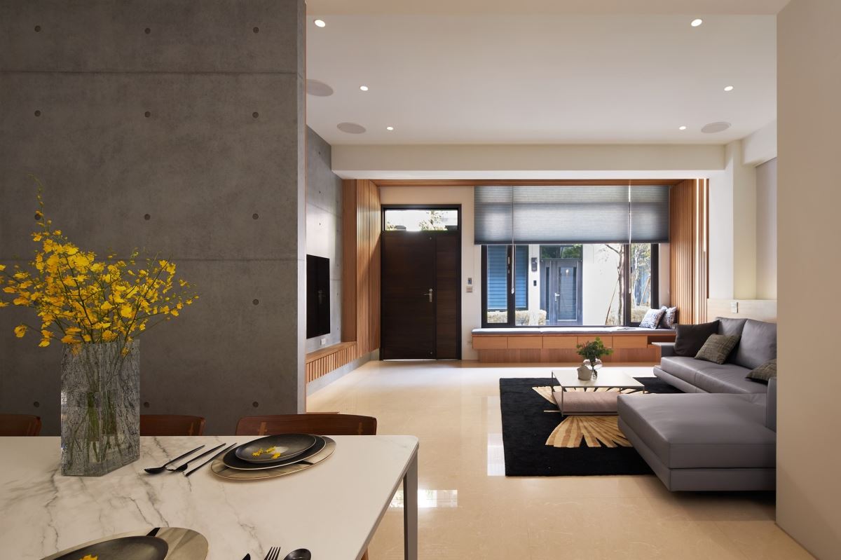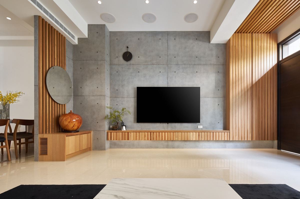電視牆嚴選清水模質感,樸實的灰階視覺營造出耐看、清爽宜人氣息,同時扮演起玄關與餐廚空間的串連角色;為了營造室內的開闊感,且避免開門見灶的風水疑慮,特別將端景牆定位於電視牆旁,入室後視覺隨之開展,並利用格柵立面讓視覺持續向上延伸,而木質的暖調特性,則平衡清水模的冷調特質,挹注溫潤氣息;立面中央輔以圓形鏡面,軟化俐落的線條感,再擺放屋主收藏的藝術器皿,交織人文美學氣息。