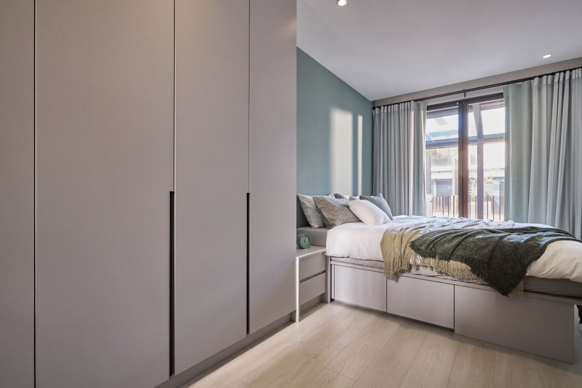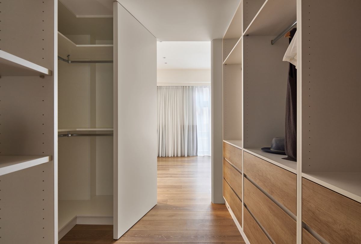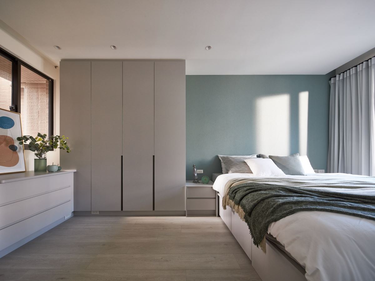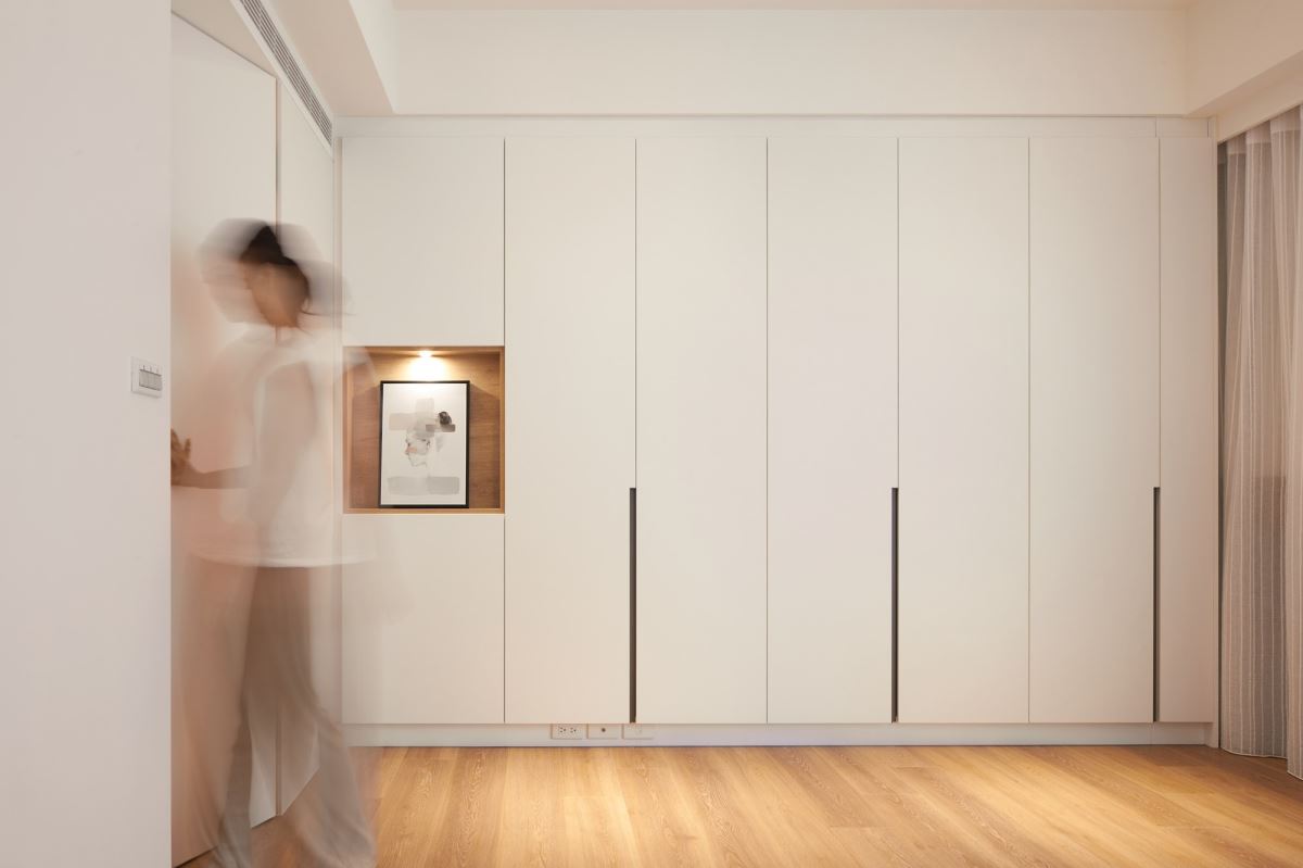 床尾安排整面白色系統櫃,搭配無把手設計,在開關門扇時,倍顯輕巧、優雅;左側利用木質方框造型的展示空間,可掛上藝術畫作或風格物件,營造美學端景視覺。對應整體立面設計,利用隱藏門打造通往更衣室與衛浴空間的入口處;在動線規劃上,從更衣室到衛浴空間安排的邏輯,則考量先保養、化妝再穿搭的出門程序,以及回家後先梳洗,再穿衣保暖的生活習慣,展現櫻花家居貼心替屋主設想最舒適、便利的質感生活。