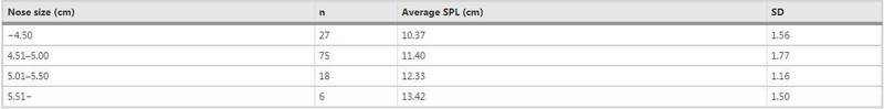 鼻子長度介於5.01至5.5公分,勃起長度12.33公分;鼻子長度大於5.51公分,勃起長度13.42公分。