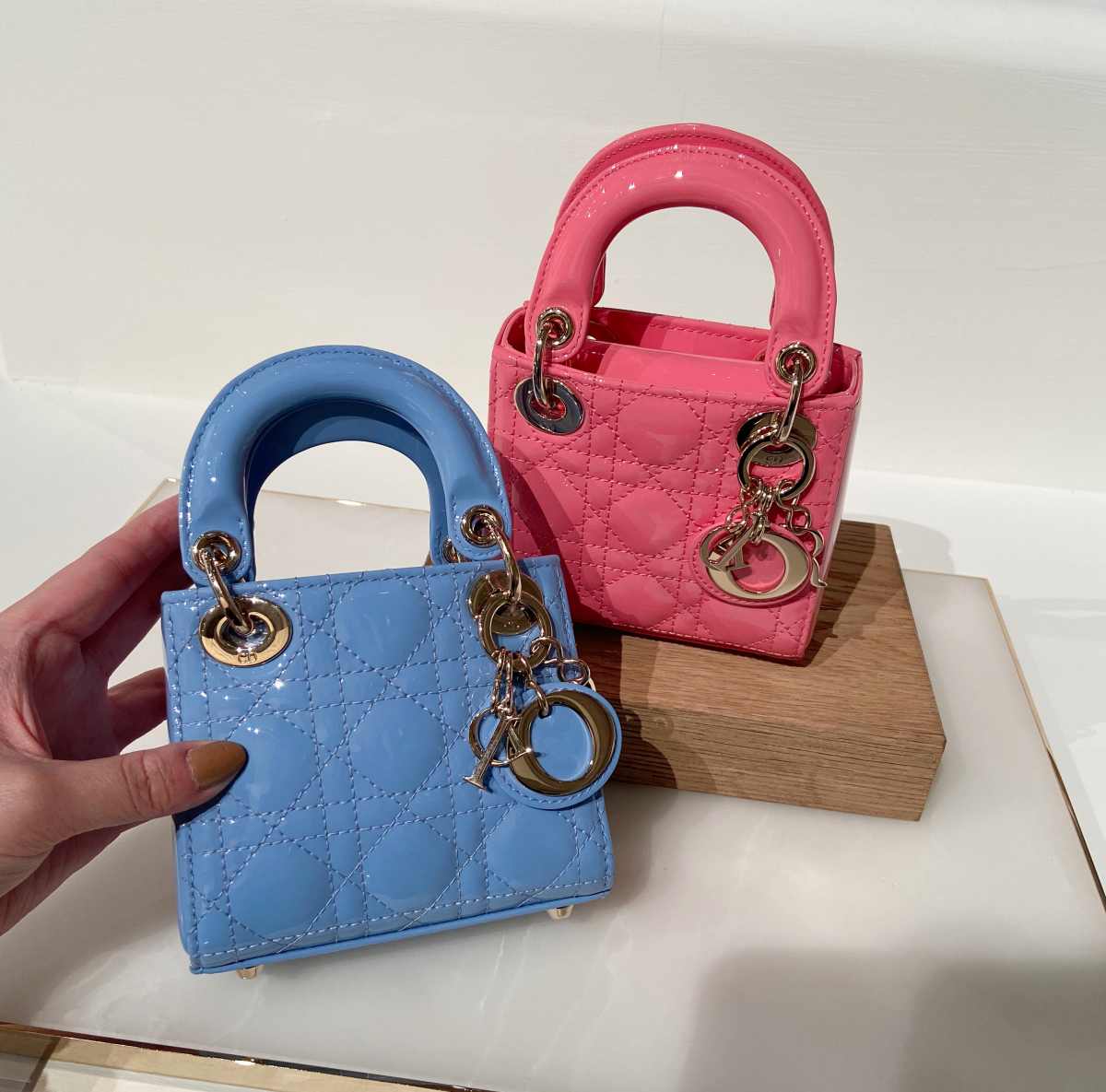 最經典的Lady Dior黛妃包怎麼能不收一個?在2022年早春度假系列中,推出了焦糖色籐格紋、粉色刺繡以及黑白千鳥格等款式,其中霧面皮革的焦糖色包款,在秋冬之際搭配上穿搭也非常活潑,而縮小尺寸的Micro黛妃包本來可愛度就超高,而且提把上的「D.I.O.R.」金屬墜飾一個也沒有少,在這次的新色中,推出了漆皮寶寶藍以及桃粉色,真的是Q到讓人受不了!