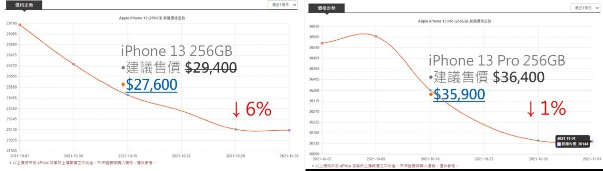 若以台灣ePrice網站iPhone13系列的市場最低空機價格(接近店家成本),iPhone13 256GB的市場最低價已經較建議售價跌了6%,但iPhone13 Pro 256GB只跌1%。