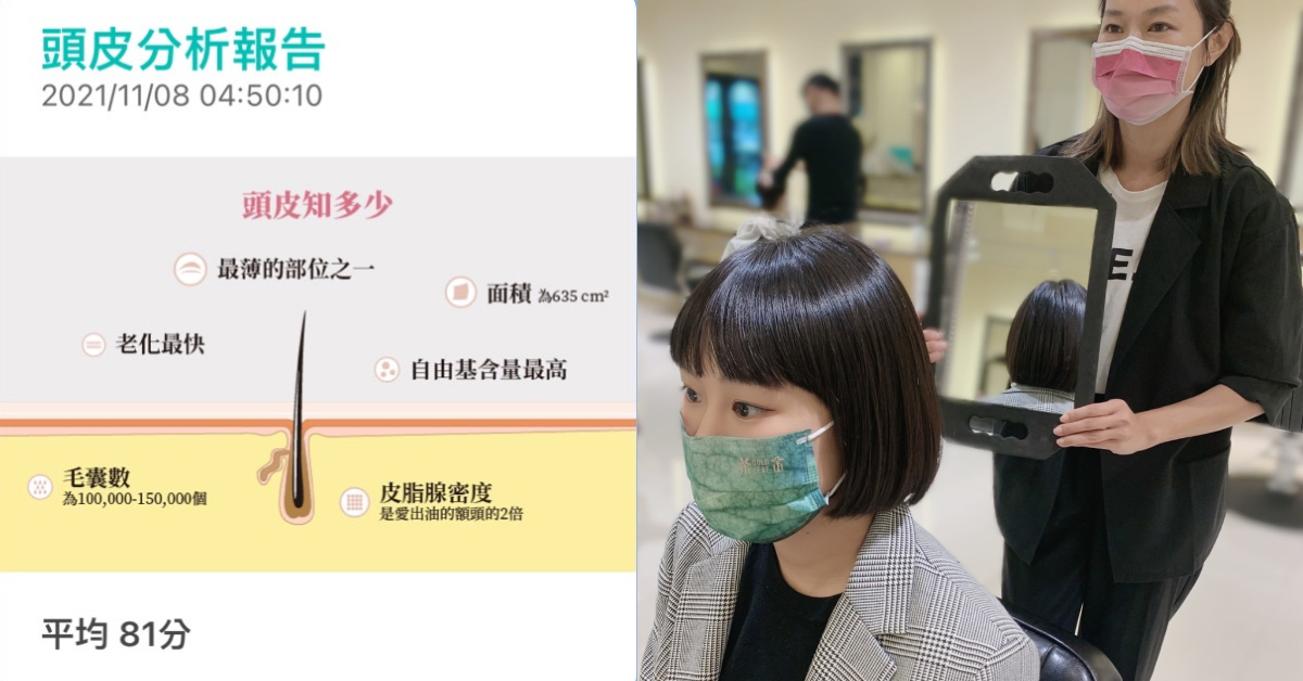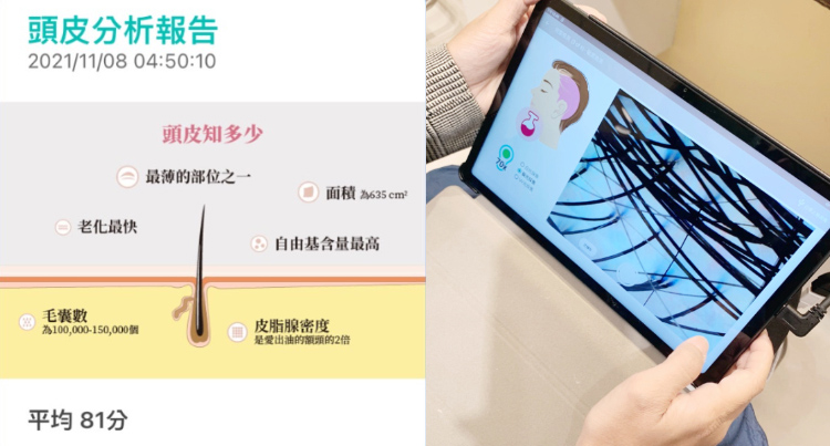 為了能更完整地分析出所有頭皮異狀,透過檢測儀發出白光、偏光、UV光共3種不同光線快速分析頭皮的7大健康問題,包含:皮脂、皮屑、敏感、髮量、髮徑和毛孔,並且將檢測數據對比受測者同年齡層的整體平均數值提出完整分析報告。而本次Joan編最大的驚喜,就是過去這27年我一直誤以為自己是油性髮質,但其實檢測出來才發現是因為整體髮徑偏細,所以容易吸收空氣中的濕氣導致頭髮易塌、瀏海常常呈現一束一束的狀態。而我最迫切的就是要改掉早晚各洗一次頭的習慣或是改用PH值5.5洗淨力較低的高頻洗髮精,否則我可能會因為過度清潔養出真正的油性頭皮。
