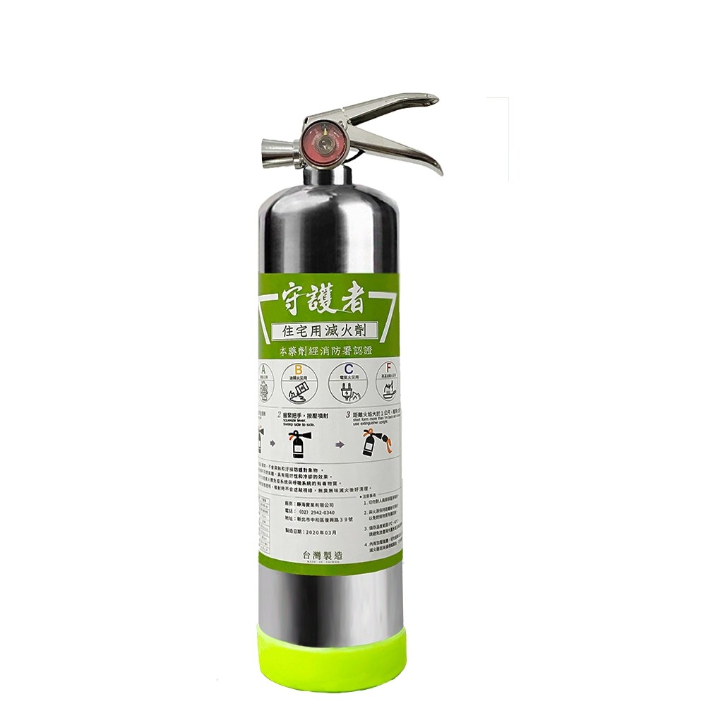 此款滅火器內裝環保要劑,不但可以確保火勢的撲滅,也不會復燃。而內容量跟一般滅火器差不多,卻輕巧好拿。以不鏽鋼製作,不需擔心家裡潮濕受潮生鏽而無法使用。跟一般滅火器一樣的使用流程,但不需要握住噴嘴,所以能更穩固的握住瓶身。