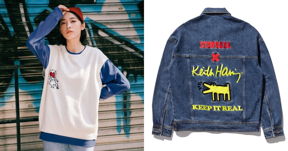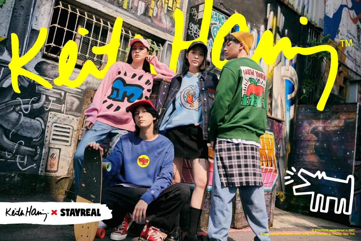聯名不斷的STAYREAL在今年首度與普普藝術大師Keith Haring推出聯名系列,以Keith Haring的街頭塗鴉作為設計靈感,挑選了多款經典與新款圖樣像是《發光的嬰兒》(Radiant Baby)、《吠叫的狗》(Barking Dog)、《愛心》(Heart)以及《紐約大蘋果》、《天使》…等加入服裝單品的細節中,更大量運用高飽和度色系,推出長T、厚棉T、針織衫、牛仔外套、連帽T等單品。