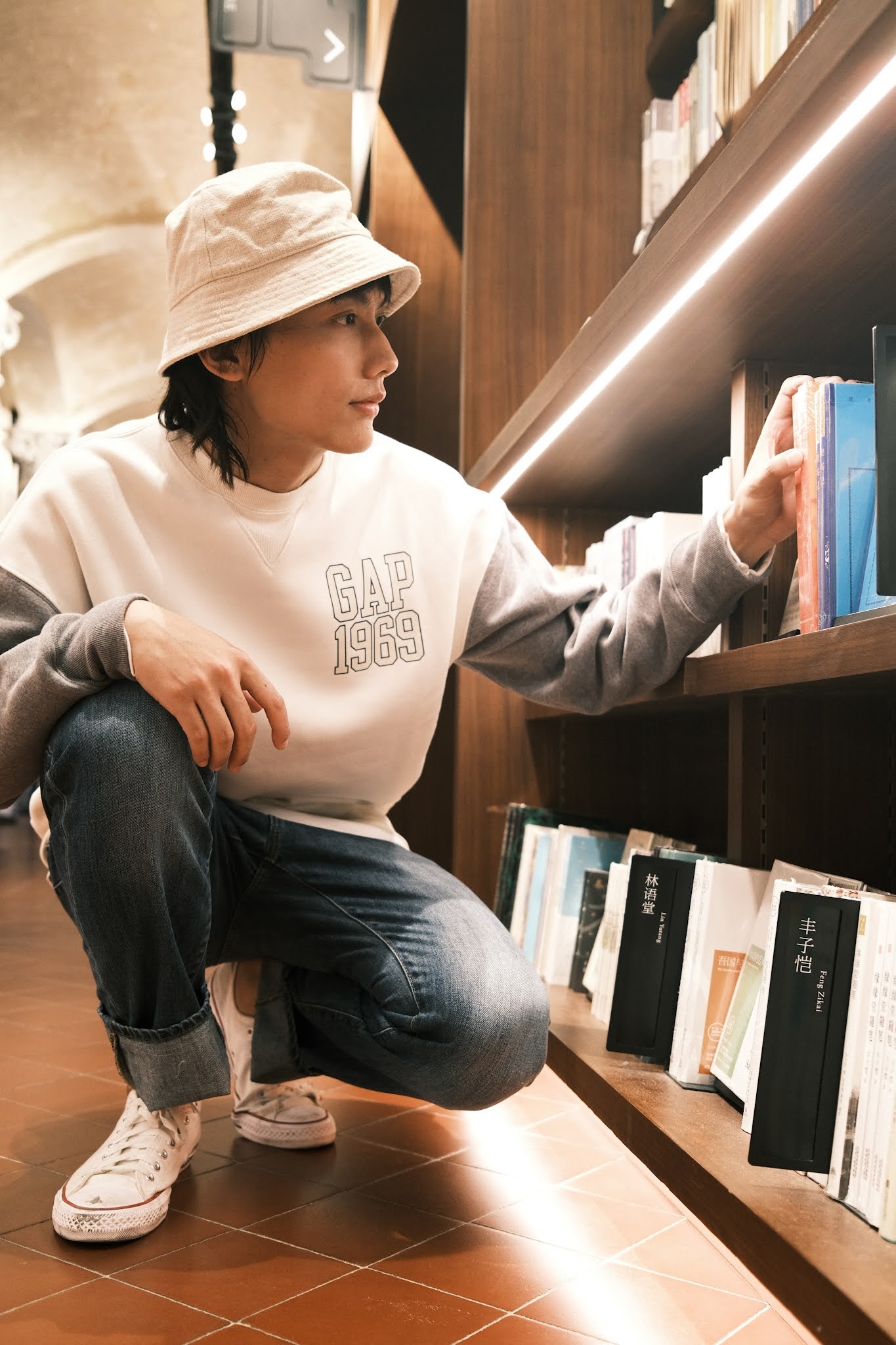 誰說休閒上衣就不能穿出文青感?換上直筒牛仔褲及高筒帆布鞋,並搭配同色系的漁夫帽,截然不同的復古風格應運而生。今年秋冬就入手這件材質舒適又有型的大學 T 單品,展現你的穿搭態度吧!