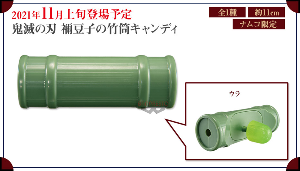 最近日本 BANPRESTO 也推出一系列人氣動漫《鬼滅之刃》的周邊商品,其中最引人關注的莫過於一款禰豆子竹筒造型奶嘴糖。根據官方介紹,這款竹筒全長為 11 公分,在竹筒的中段位置也設計了一顆青蘋果口味的糖果。