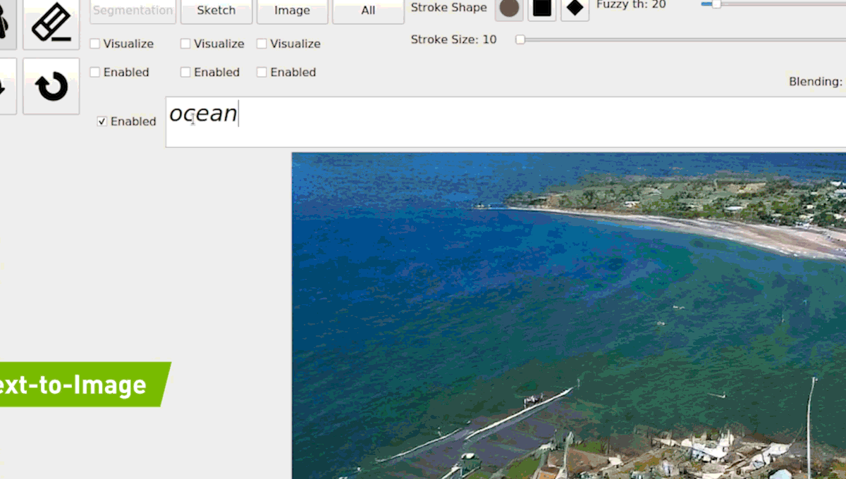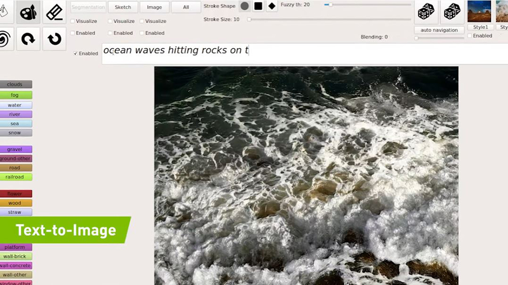 借助 GauGAN2,NVIDIA 研究員透過以文字簡單的敘述輸入,讓 AI 判讀後展示出它的理解,該模型使用各式各樣的草圖(大約內建 1,000 萬張高品質的風景圖像)作為其視覺資料庫,並利用該資料庫來決定你的文字在藝術作品中所代表的涵義。GauGAN2 中的單個 GAN 框架包括多種模式,包含文字、語義分割、草稿和樣式等項目,下面你將能看到這個新文字輸入元素的運作: