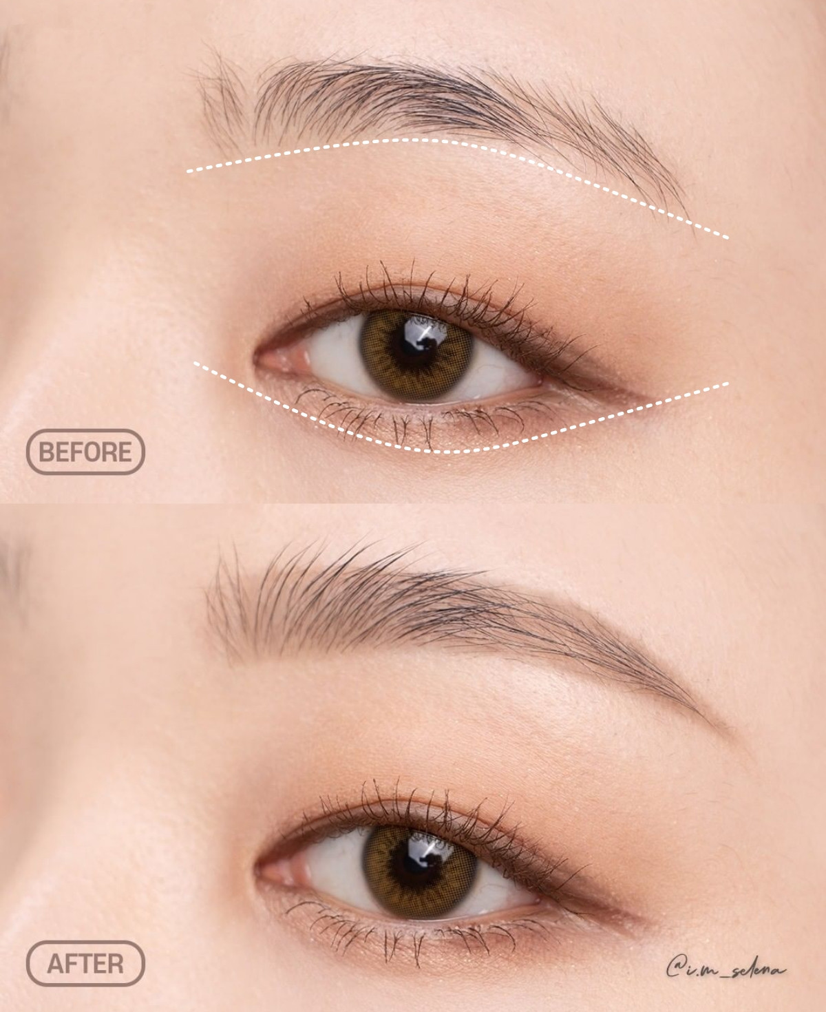 接著就是重點,將下眼瞼曲線翻轉到眉毛上,這邊特別注意,翻轉不是說一定要對到完全一致,就是兩條線盡可能平均、走向一致即可,這時候也可以觀察一下你的眉型,是不是都修的太平、缺少弧度?眉眼形狀平均的話,整體會像是杏仁型,不會有太突出的角度,眉型也是自然柔和。