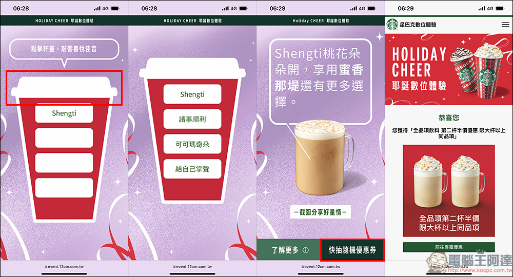 在活動頁免點擊護面中的杯蓋,接著直到畫面顯示「快抽隨機優惠券」按鈕即可點擊抽獎。這次的優惠券採隨機方式抽取,除了有機會獲得全品項飲料買一送一,還有機會抽到全品項買二送一、全品項第二杯半價、FOOD PARING 折扣 30 元等優惠。
