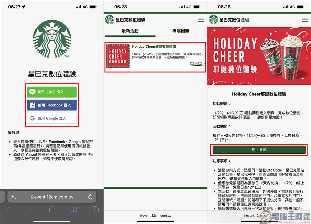 民眾只需在活動期間前往星巴克數位體驗活動頁面,並選擇使用 LINE 、 Facebook 或 Google 帳號進行登入便能參加活動。