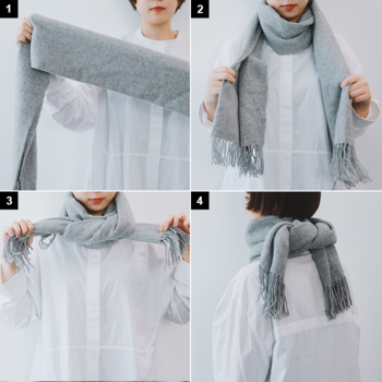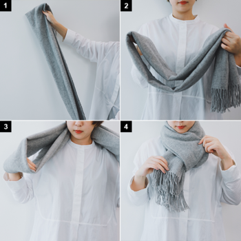 第一步驟就要把整條圍巾對折,選擇磅數越高的圍巾效果會越好!營造出厚厚軟綿的圍巾質感!