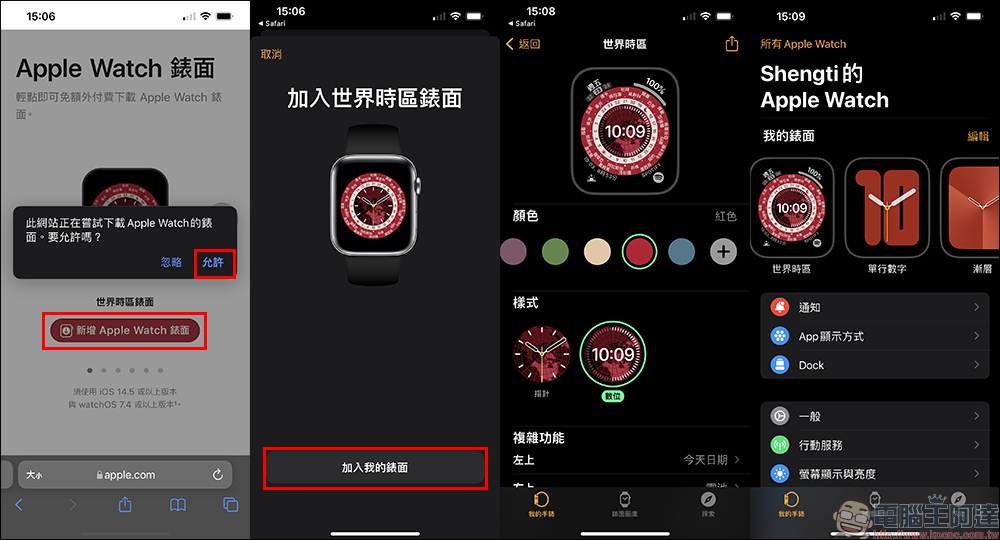 開啟 Apple (PRODUCT)RED 網頁後,在喜歡的 Apple Watch 錶面主題後下方點選「新增 Apple Watch 錶面」按鈕,接著選擇「允許」下載和「加入我的錶面」後,就能將這 (PRODUCT)RED 限定錶盤顏色加入自己的錶面圖庫囉!各位也能根據個人使用習慣在特定錶面進一步設定複雜功能。