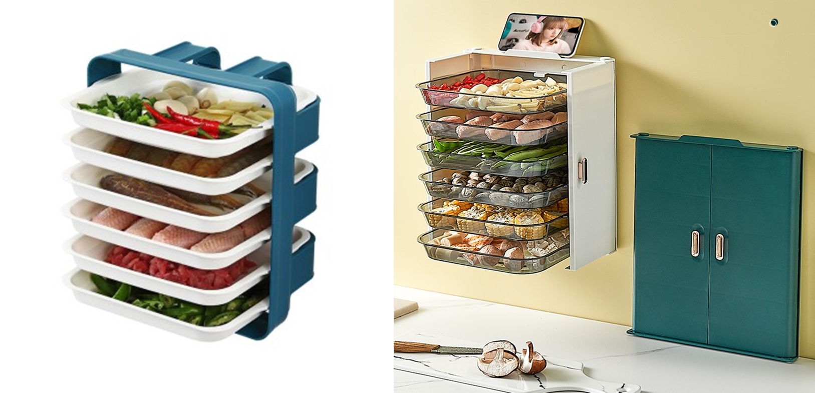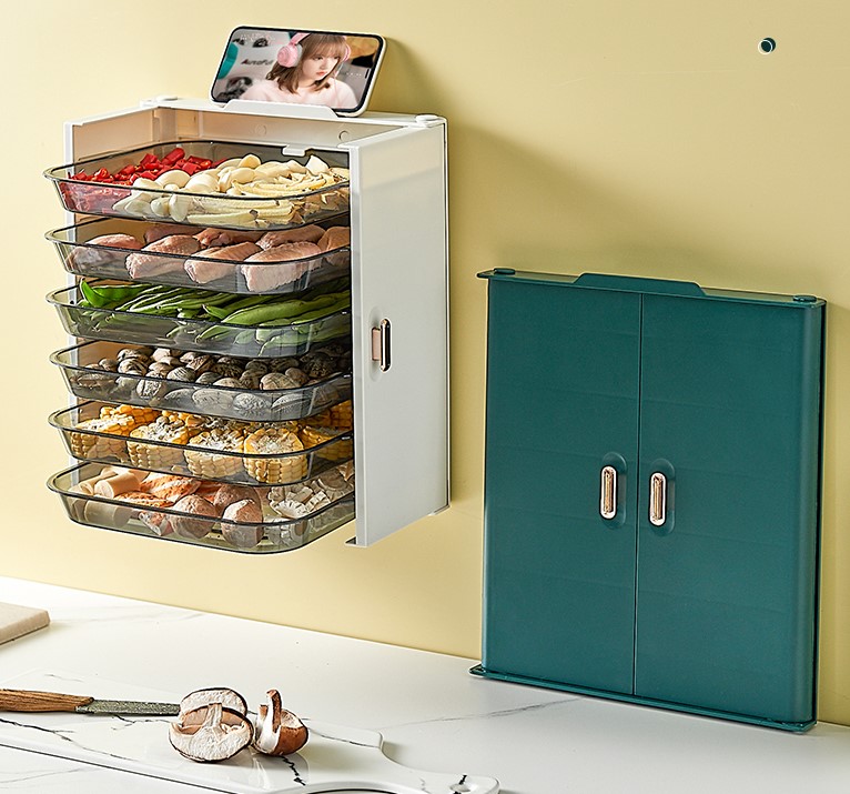 多層抽屜式設計,加高加大容量,最上層也充分利用,可放置更多的食材,好抽好擺放。能擺放桌面,亦掛牆面上使用,清楚分類每層配菜,讓做菜可一目了然的更輕鬆快速完成,不再手忙腳亂。底部簍空瀝水設計,也不留水漬,清洗方便。