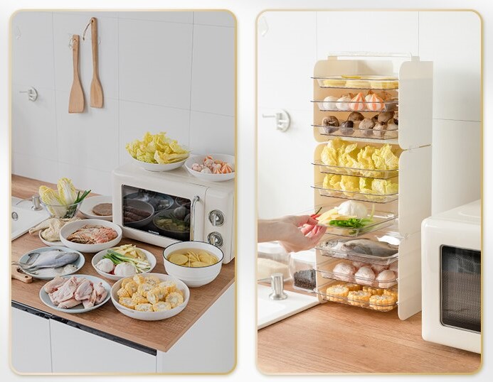 以四、五層抽屜式分隔設計,可以疊放的增加層數,且頂部二層以2格分類收納菜品,適合備放少量的辛香料,食材不串味,亦更好區分分類;以及配菜盤內有凹凸圓點設計,方便瀝水。不當配菜盤使用,也能拿來收納馬克杯或是沖泡飲,及收納小物,讓物品能更彈性利用,亦可放入洗碗機、清毒機內清潔消毒,也可放置於冰箱內保鮮食材,使用性方便。