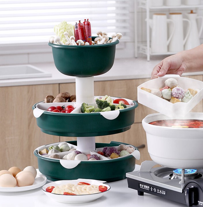 三層分格式拼盤設計,可拆卸、分格與旋轉使用,能放蔬果、肉品、火鍋料,甚至於節慶聚會時放糖果餅乾,也很適合收納多種食材,並能360度旋轉,拿取便利。超大容量,讓桌面從此不再凌亂,而且平時也能當水果盤利用。
