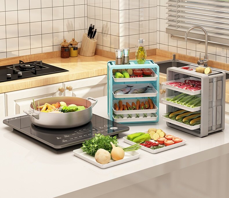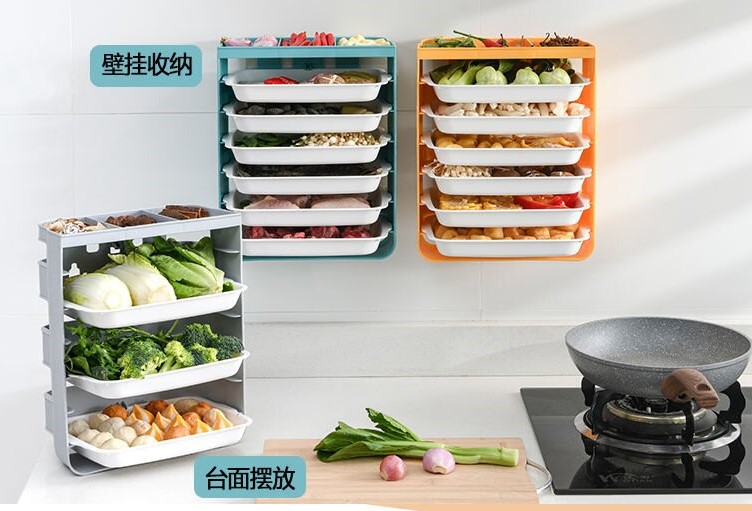 六層備菜盤,一次能滿足家庭日常所需備菜量。可折疊收納,不用時,折疊存放廚櫃內節省空間。能擺放檯面上,也可壁掛使用,頂層還可放置調味罐,讓物品、食材通通都能收納,亦可依照食材尺寸而調整使用高度,不論是備料或煮火鍋都方便又彈性。