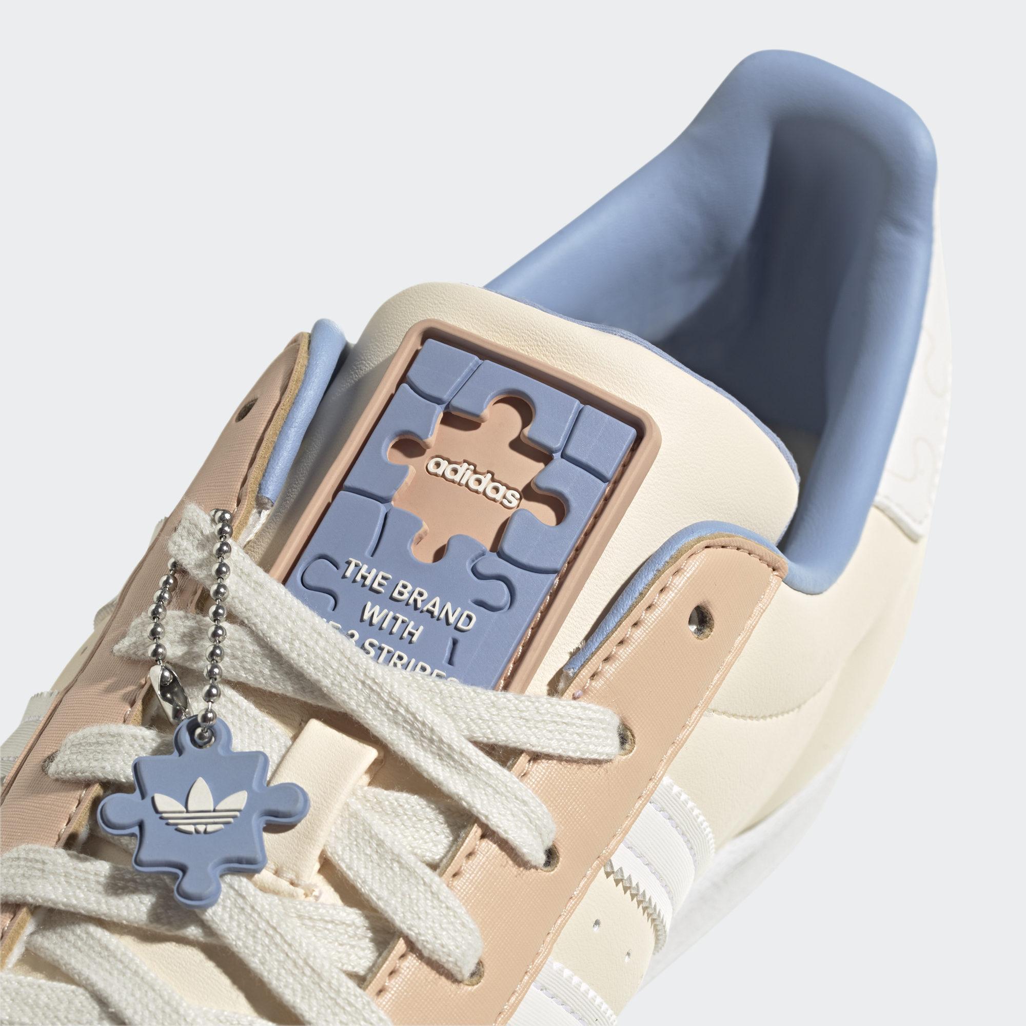 這款adidas推出的SUPERSTAR 經典鞋以經典籃球鞋為設計基礎,採用平滑鞋面和經典橡膠貝殼型鞋頭,向過往元素致敬。下列組合可說是天生絕配:奶油和果醬、星期五和披薩、週末時光和拼圖活動。穿上這款拼圖風格的 adidas Superstar 經典鞋,尋找你的最佳夥伴。吊掛在鞋帶上的拼圖墜飾則為造型增添一抹趣味,別搞丟了,沒人喜歡缺一片的拼圖。
