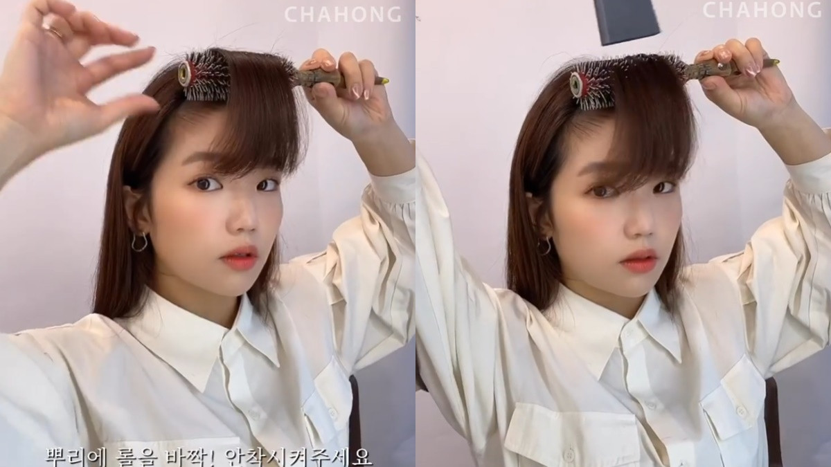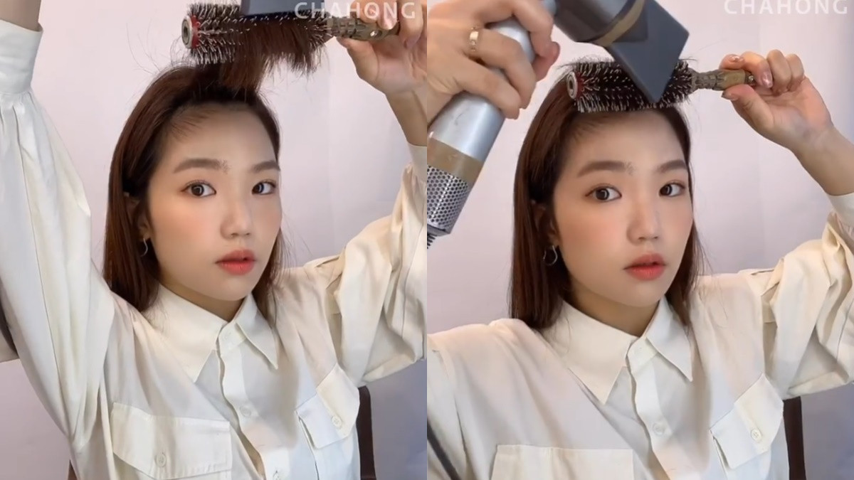 大致修剪好長度後,就可以拿出圓梳繞捲瀏海,順著髮根>髮尾>髮根,搭配吹風機加熱這樣來回一次吹整約50秒,就能很有效地幫助瀏海定型。