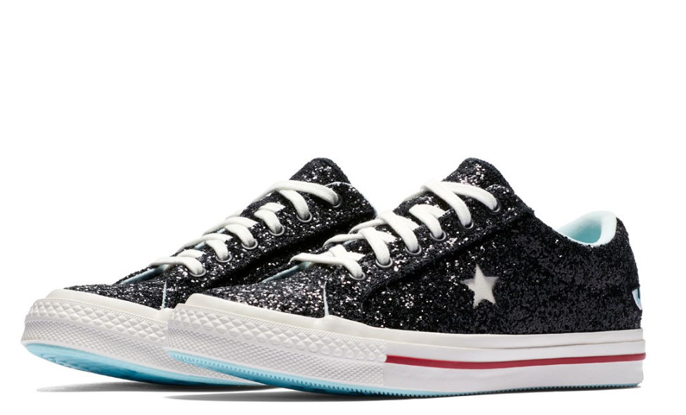 接下來完全顛覆低調色系的是粉嫩色系,例如這款薰衣草紫的低筒帆布鞋。這個顏色十分適合春天,不禁讓人想到山上盛開的野花呢~5. Converse x Chiara Ferragni 黑亮片單眼休閒鞋