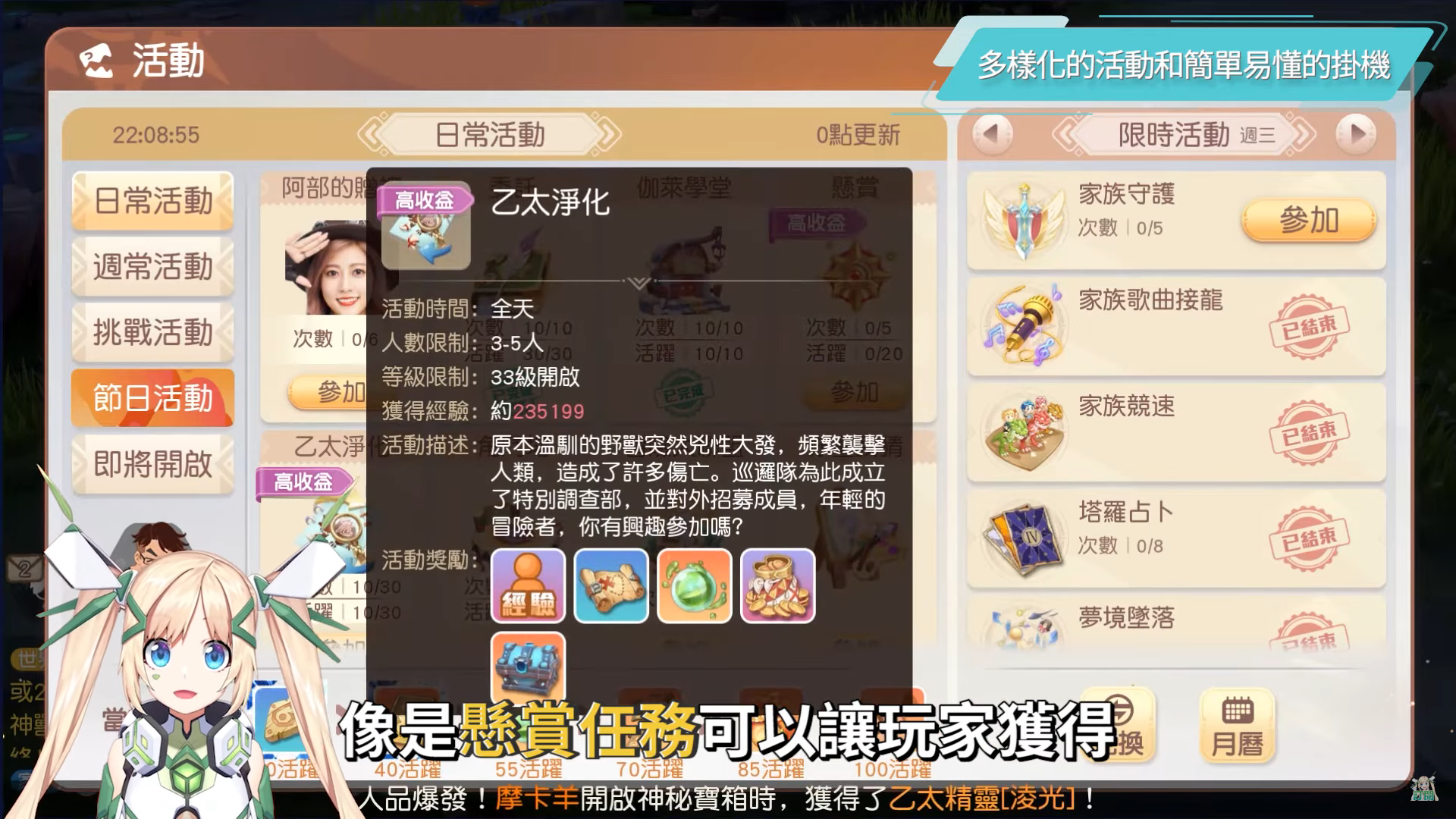 如果中間遇到打不贏戰鬥或過不了任務的狀況也沒關係,遊戲內每天都準備了多樣化的活動等著玩家來參與。像是懸賞任務可以讓玩家獲得稀有的獎勵、委託任務則可以讓玩家獲得大量的經驗值,其中甚至還有跟著代言人阿部瑪利亞一起跑遍世界觀光的任務,以及高收益的乙太淨化能夠練等、又或是彩蛋性質的任務存在。隨著日期不同,還會有其他的限定活動等著你來參與喔!