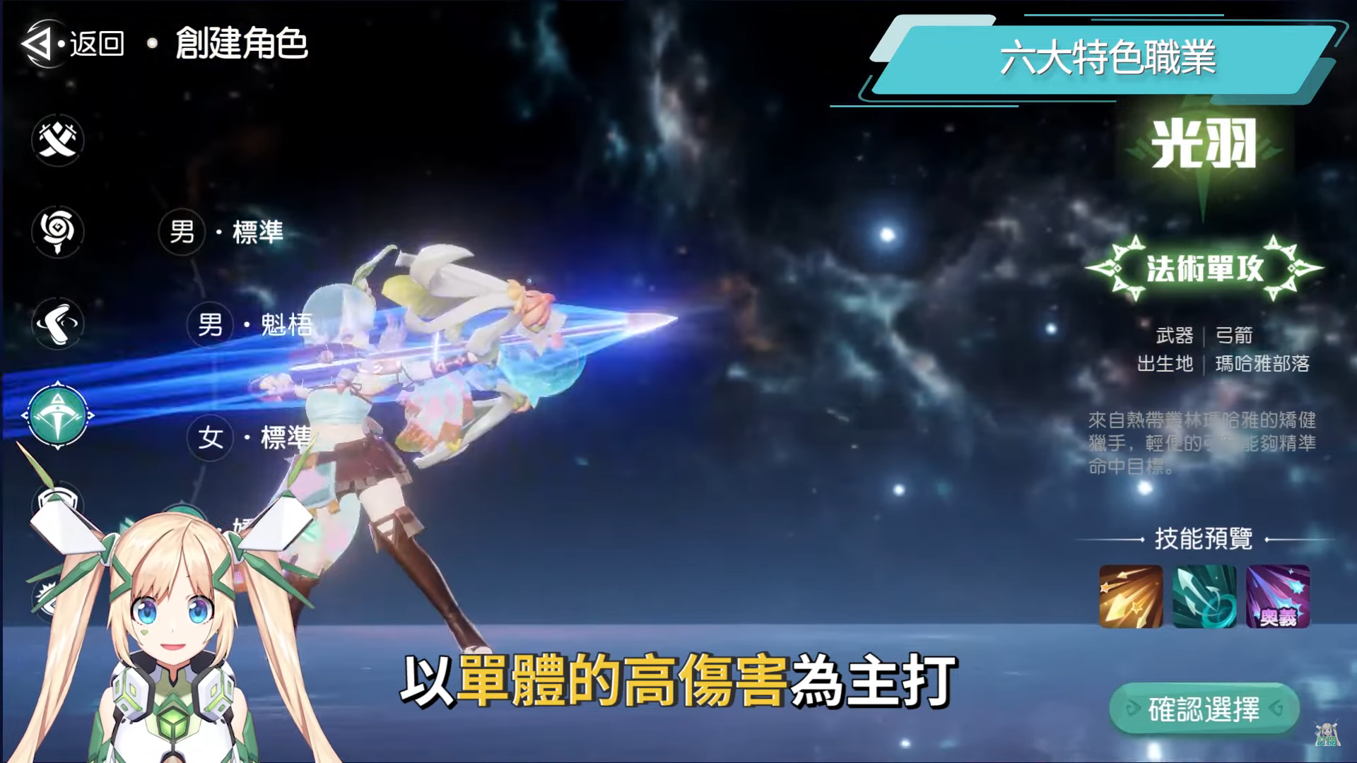 一進入遊戲,很快就能看到遊戲所準備的六大職業,這六大職業包含了影舞、星芒、風語、光羽、神諭跟幻樂。