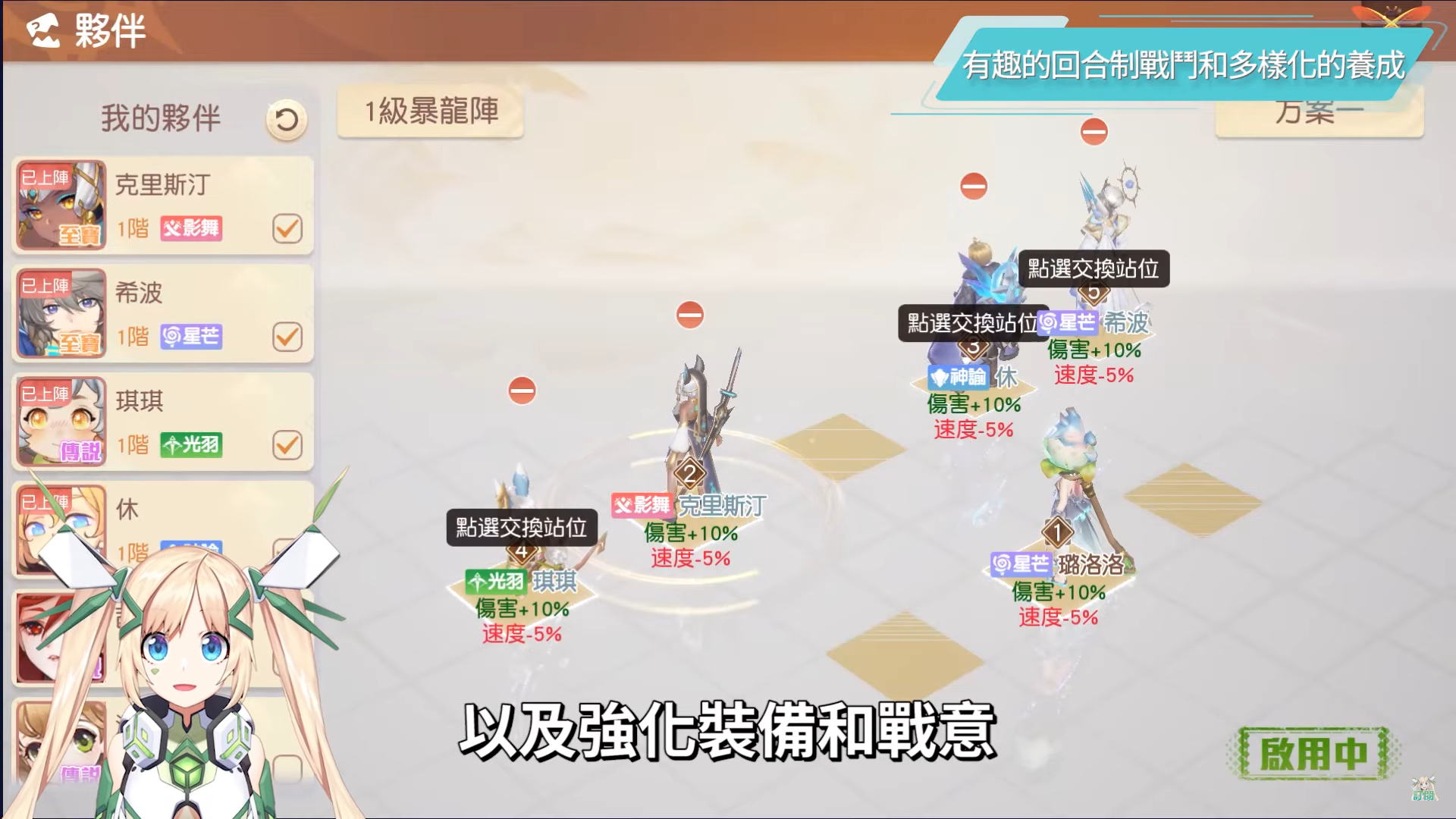 遊戲內除了有機制有趣的回合制戰鬥外,玩家的養成手段也相當豐富。玩家可以透過決定要攜帶的夥伴和寵物定位來打造不同的隊伍風格。還可以透過各種陣型、以及強化裝備和戰意來培養自身的戰鬥力。像是洛洛的這隻星盲,就比較適合站在後方輸出,並安排強力的近戰夥伴來吸引砲火。且各式各樣的關卡還會有更複雜的機制等著玩家挑戰喔!