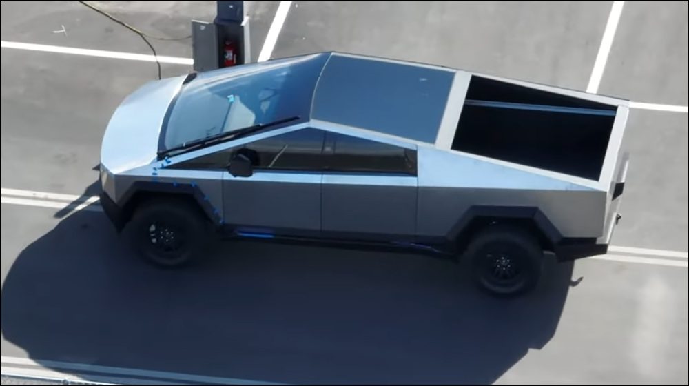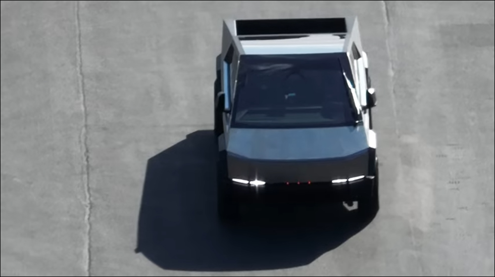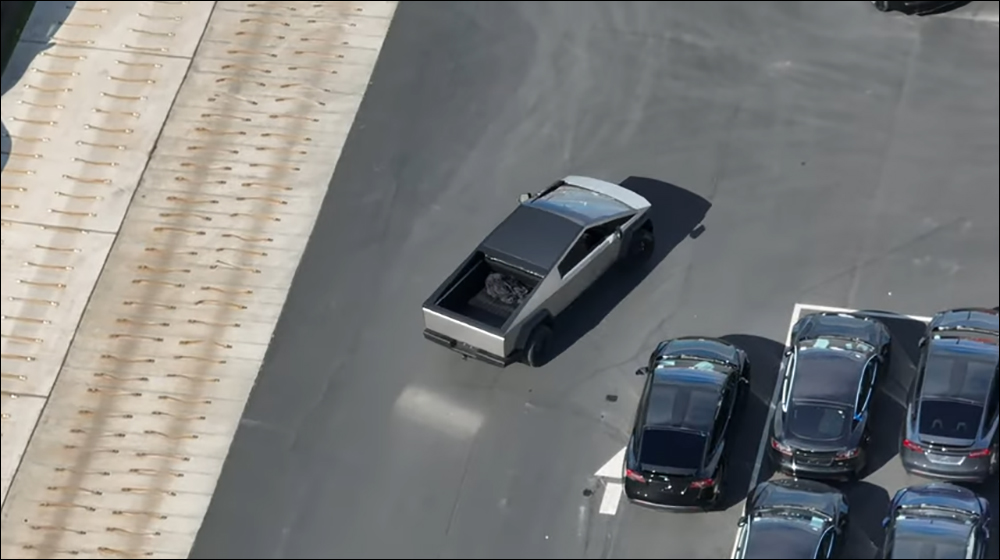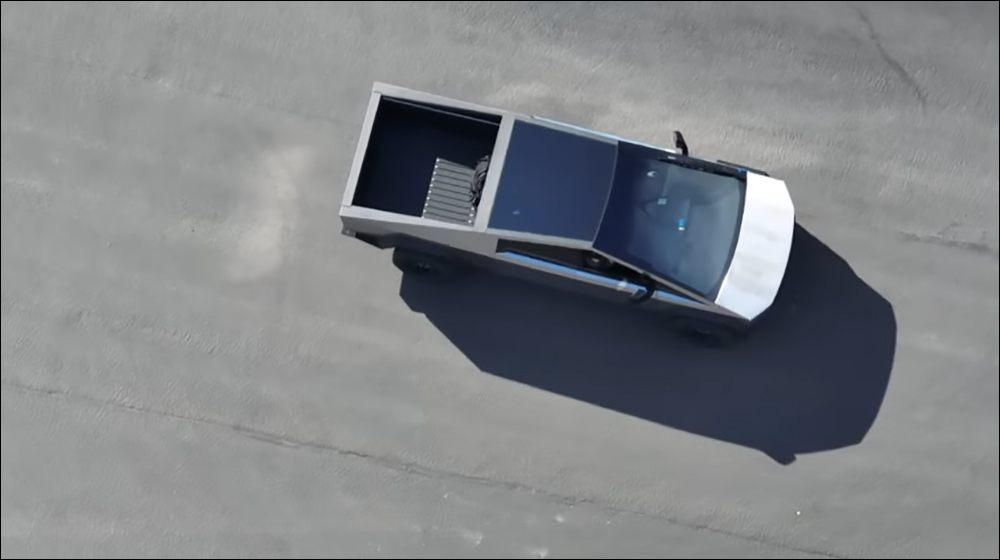 從空拍的畫面還能見到 Cybertruck 後斗內部的樣貌。